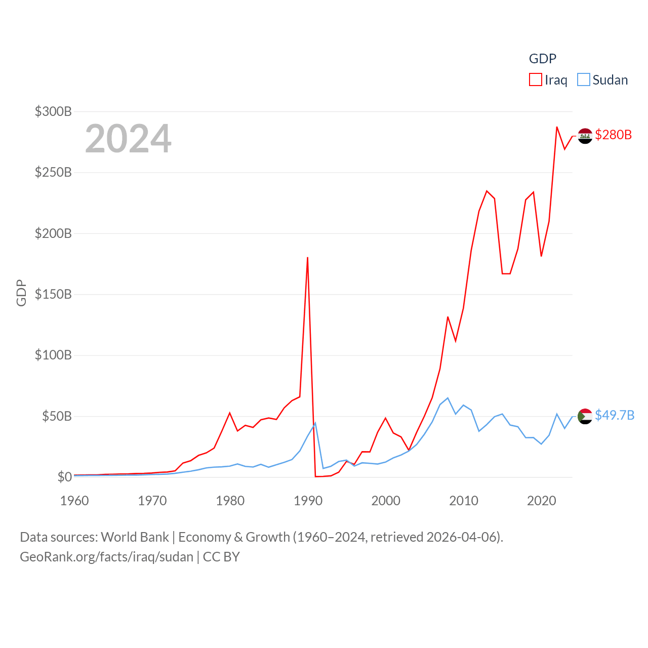 By GDP, Iraq ranks 50/197 ($280B) and Sudan ranks 94/197 ($49.7B). By GDP per capita, Iraq ranks 113/197 ($6,074), while Sudan ranks 179/197 ($985).