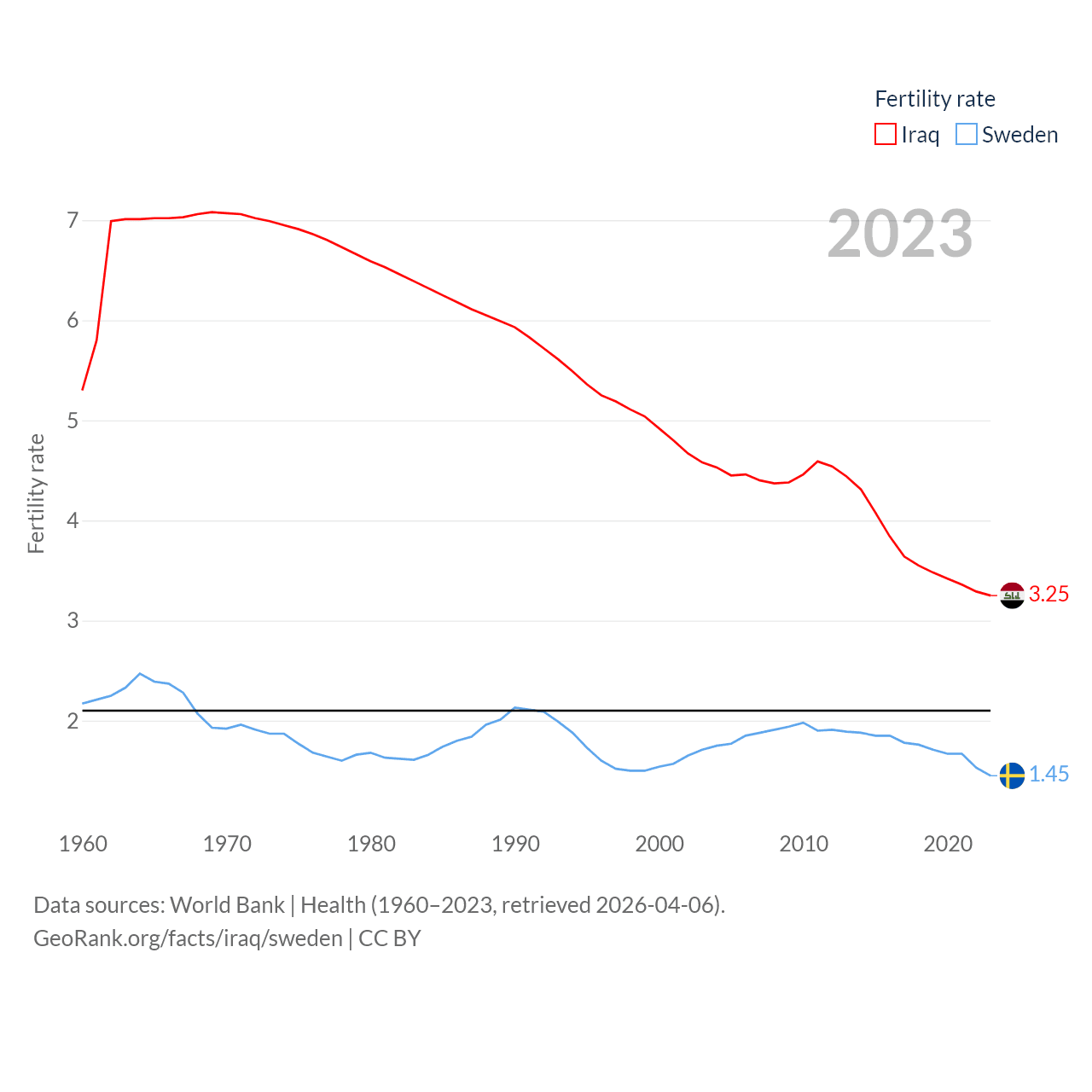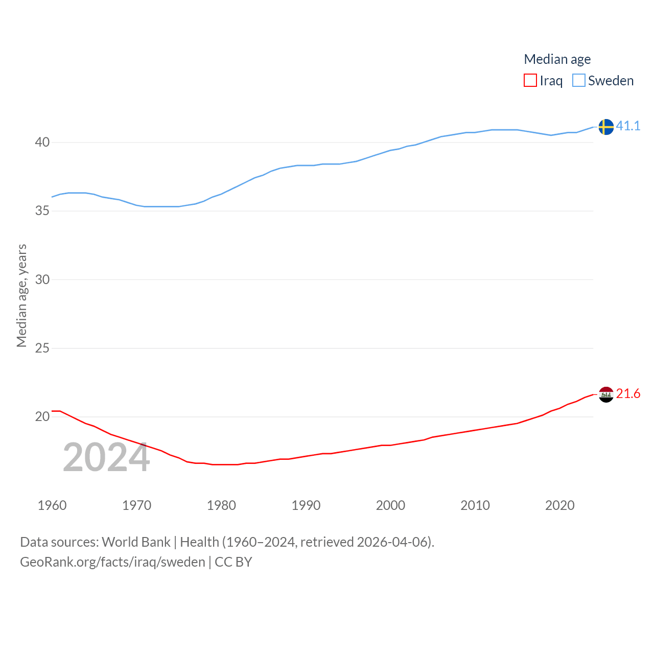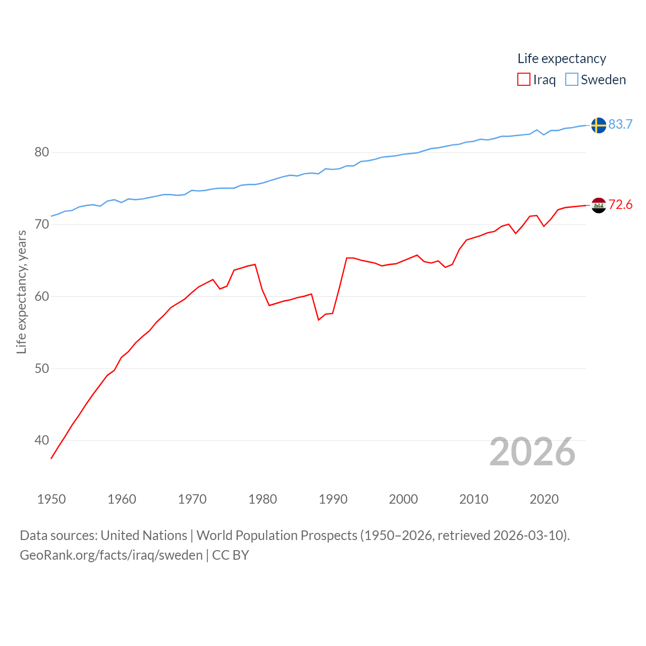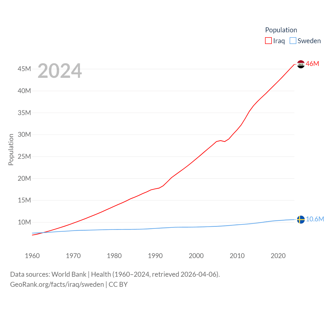 Iraq has a population of 46M (ranked 34/197), compared with 10.6M in Sweden (ranked 93/197). Iraq's land area is 167,619 sq mi versus 157,248 sq mi for Sweden (ranked 57th vs. 58th).