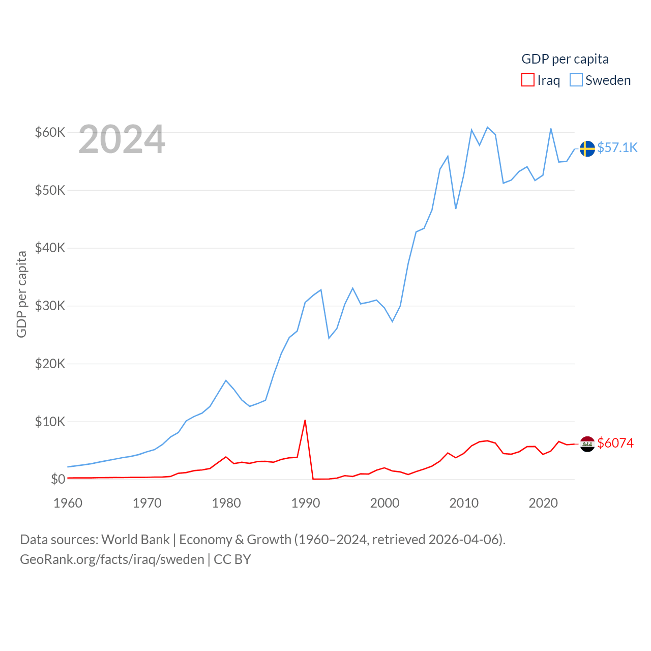 By GDP, Iraq ranks 50/197 ($280B) and Sweden ranks 26/197 ($604B). By GDP per capita, Iraq ranks 113/197 ($6,074), while Sweden ranks 17/197 ($57,117).