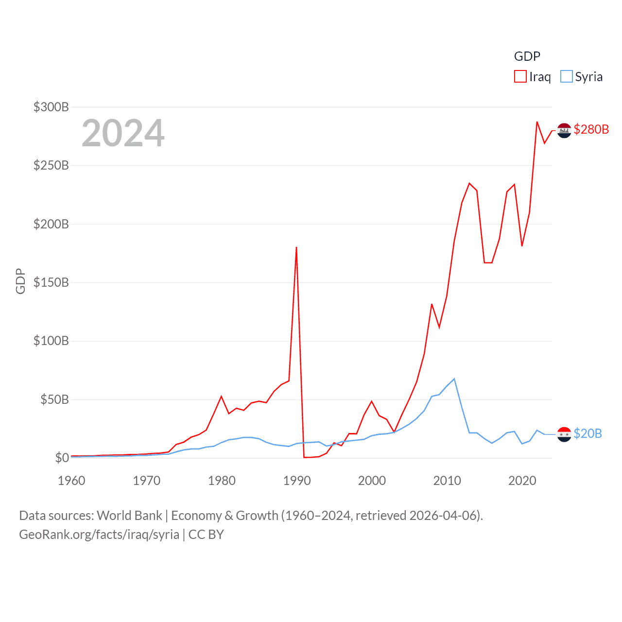 By GDP, Iraq ranks 50/197 ($280B) and Syria ranks 129/197 ($20B). By GDP per capita, Iraq ranks 113/197 ($6,074), while Syria ranks 185/197 ($847).