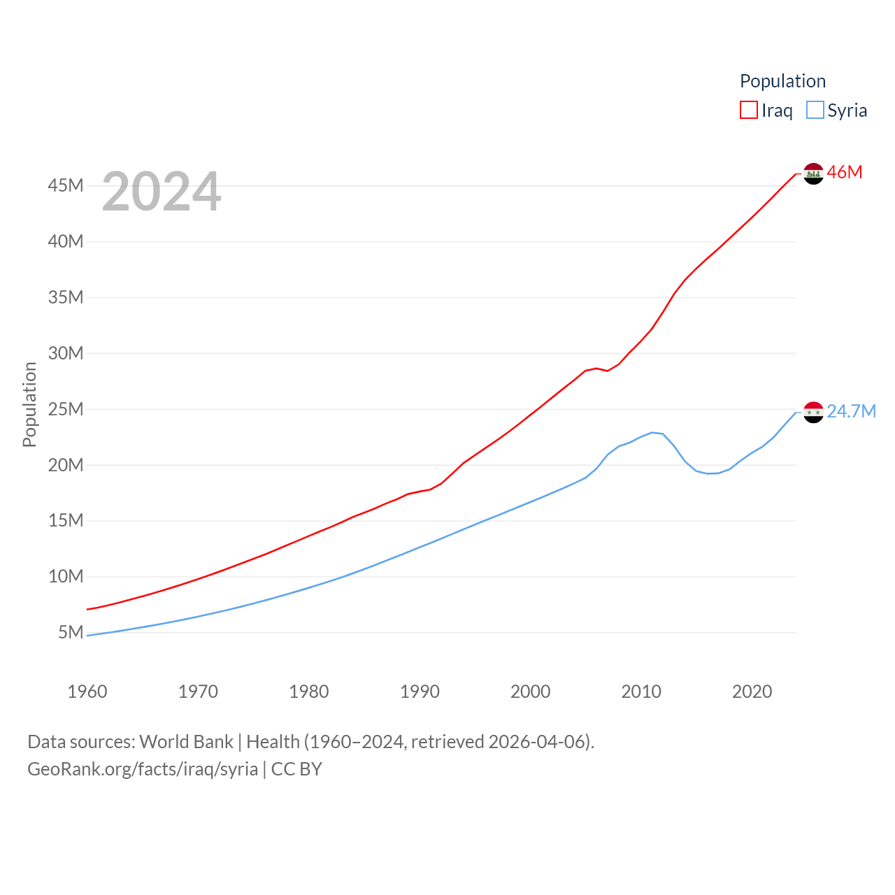 Iraq has a population of 46M (ranked 34/197), compared with 24.7M in Syria (ranked 57/197). Iraq's land area is 167,619 sq mi versus 70,900 sq mi for Syria (ranked 57th vs. 87th).