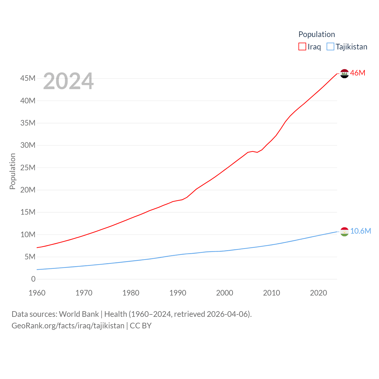 Iraq has a population of 46M (ranked 34/197), compared with 10.6M in Tajikistan (ranked 91/197). Iraq's land area is 167,619 sq mi versus 53,587 sq mi for Tajikistan (ranked 57th vs. 93rd).