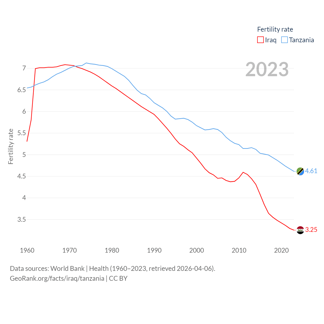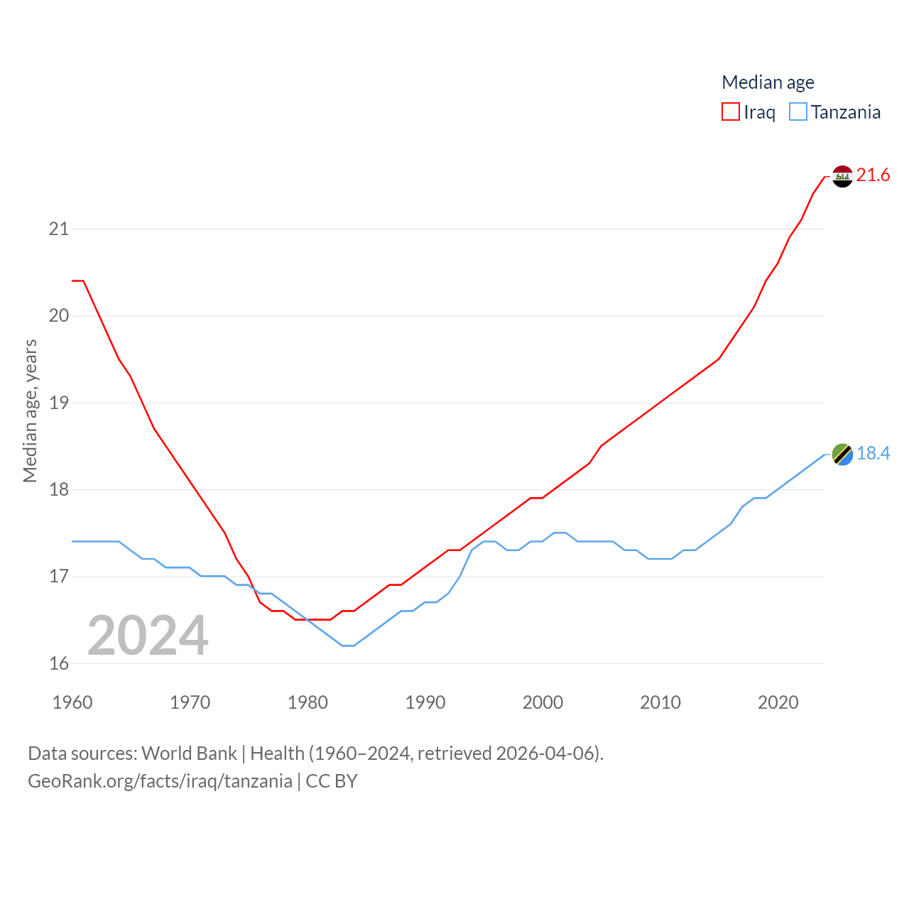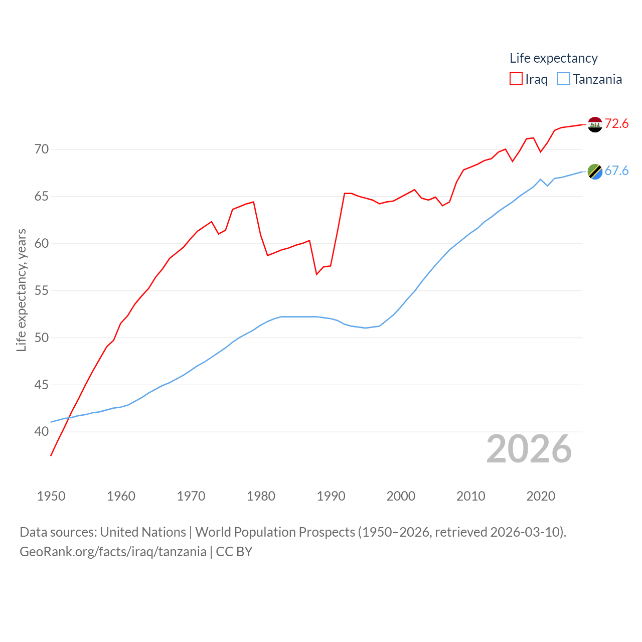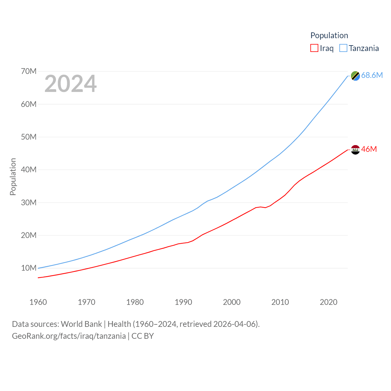 Iraq has a population of 46M (ranked 34/197), compared with 68.6M in Tanzania (ranked 22/197). Iraq's land area is 167,619 sq mi versus 342,009 sq mi for Tanzania (ranked 57th vs. 31st).