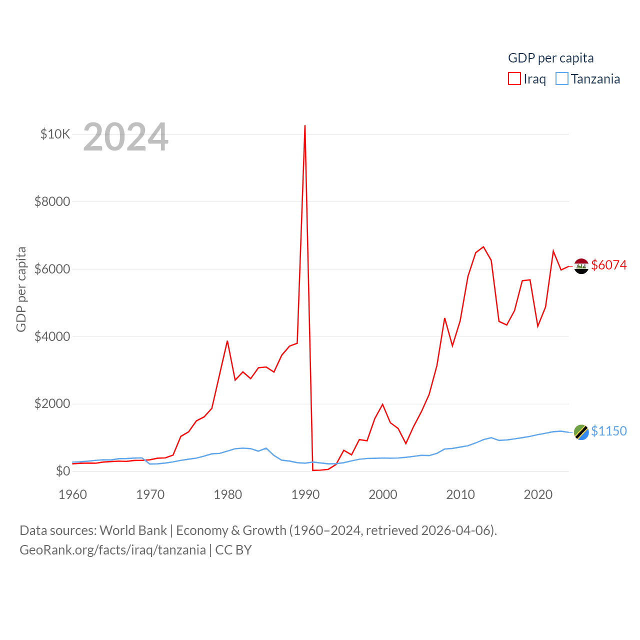 By GDP, Iraq ranks 50/197 ($280B) and Tanzania ranks 82/197 ($78.8B). By GDP per capita, Iraq ranks 113/197 ($6,074), while Tanzania ranks 170/197 ($1,150).