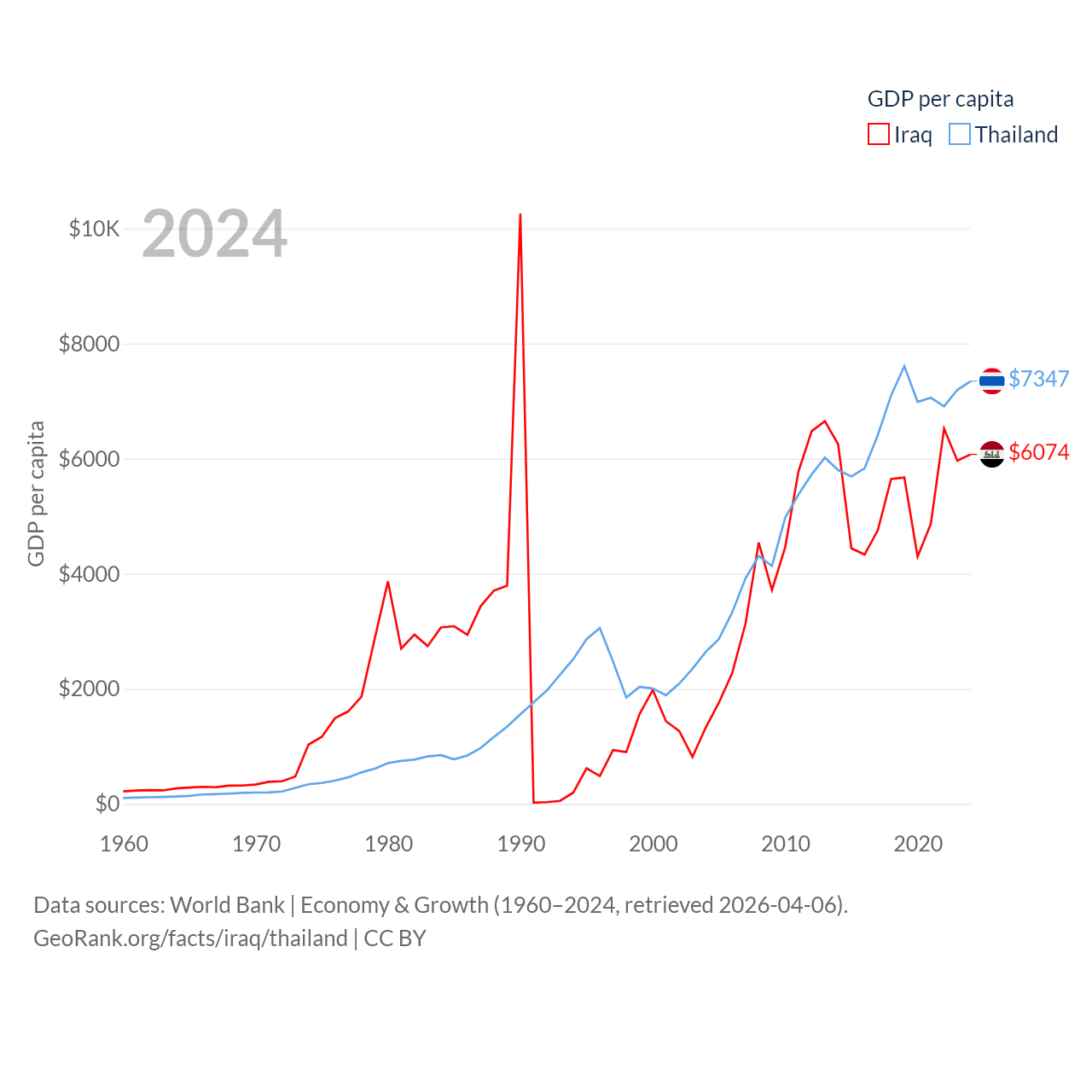By GDP, Iraq ranks 50/197 ($280B) and Thailand ranks 31/197 ($527B). By GDP per capita, Iraq ranks 113/197 ($6,074), while Thailand ranks 100/197 ($7,347).