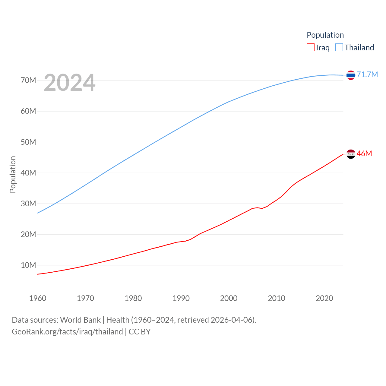 Iraq has a population of 46M (ranked 34/197), compared with 71.7M in Thailand (ranked 20/197). Iraq's land area is 167,619 sq mi versus 197,256 sq mi for Thailand (ranked 57th vs. 50th).
