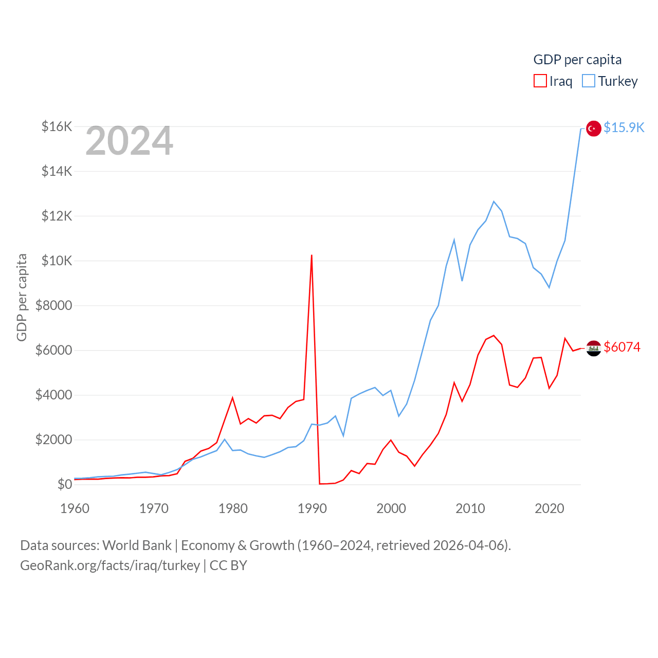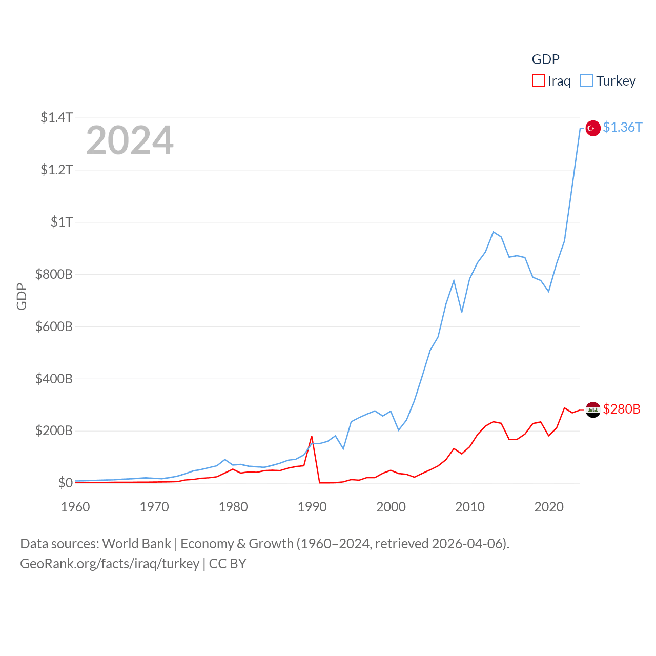 By GDP, Iraq ranks 50/197 ($280B) and Turkey ranks 17/197 ($1.36T). By GDP per capita, Iraq ranks 113/197 ($6,074), while Turkey ranks 66/197 ($15,893).