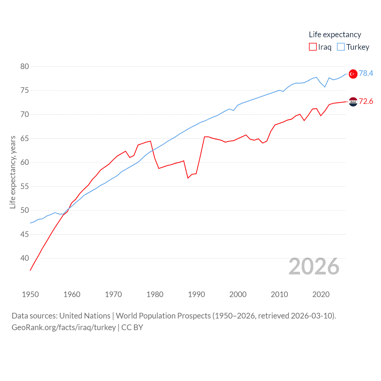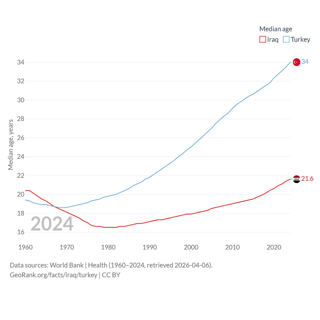Iraq has a population of 46M (ranked 34/197), compared with 85.5M in Turkey (ranked 18/197). Iraq's land area is 167,619 sq mi versus 297,156 sq mi for Turkey (ranked 57th vs. 36th).