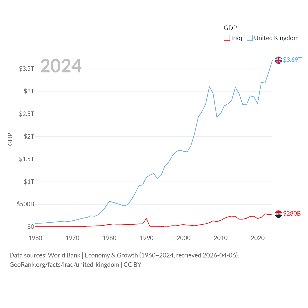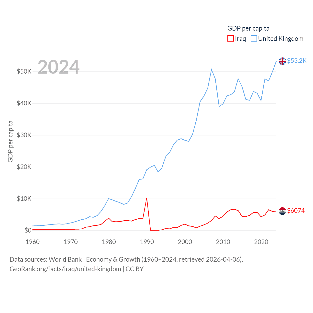 By GDP, Iraq ranks 50/197 ($280B) and The United Kingdom ranks 6/197 ($3.69T). By GDP per capita, Iraq ranks 113/197 ($6,074), while The United Kingdom ranks 22/197 ($53,246).