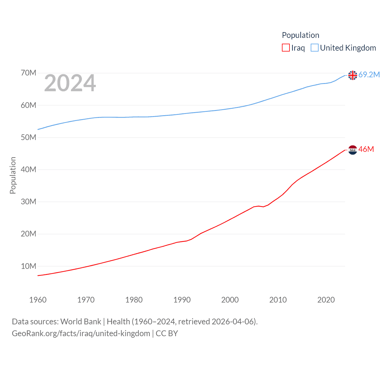 Iraq has a population of 46M (ranked 34/197), compared with 69.2M in The United Kingdom (ranked 21/197). Iraq's land area is 167,619 sq mi versus 93,410 sq mi for The United Kingdom (ranked 57th vs. 78th).