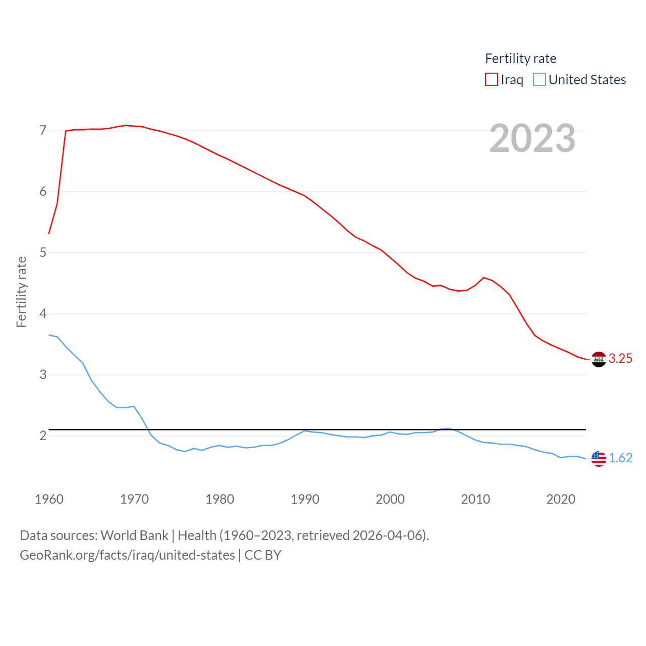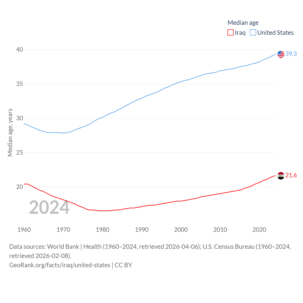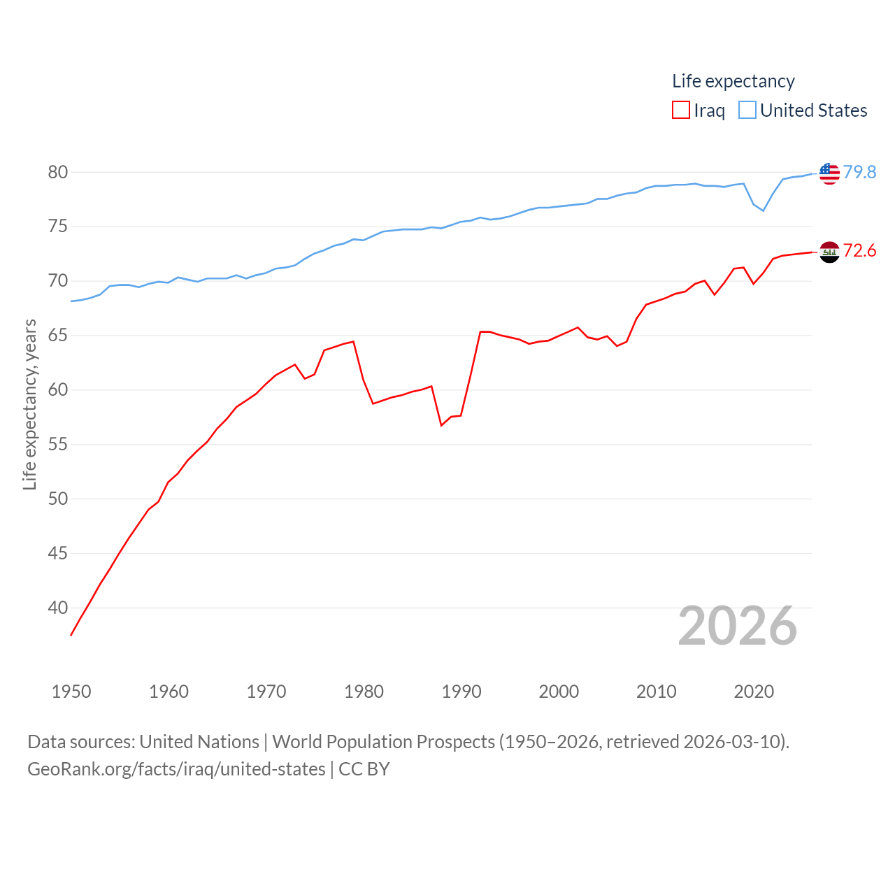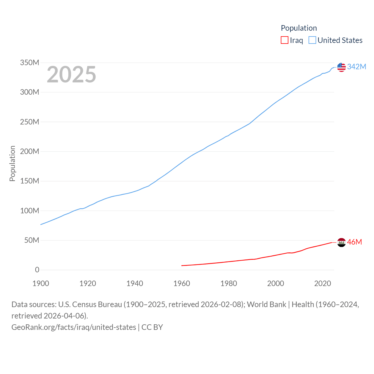 Iraq has a population of 46M (ranked 34/197), compared with 342M in The United States (ranked 3/197). Iraq's land area is 167,619 sq mi versus 3,531,839 sq mi for The United States (ranked 57th vs. 3rd).