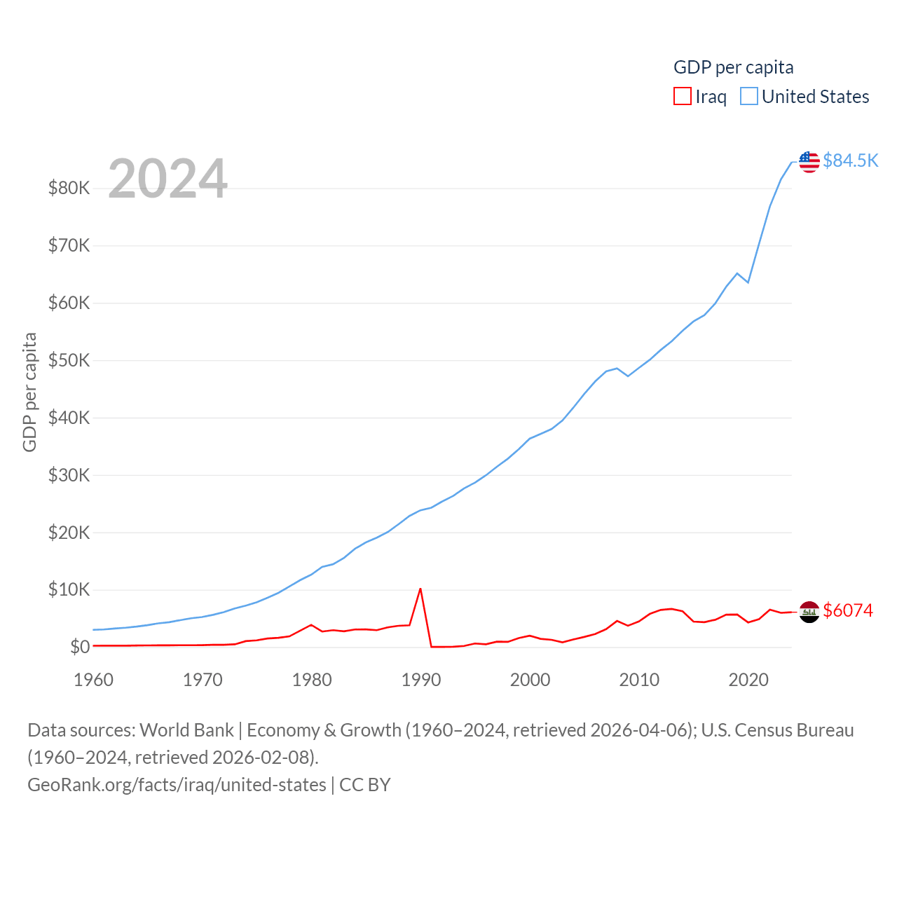 By GDP, Iraq ranks 50/197 ($280B) and The United States ranks 1/197 ($28.8T). By GDP per capita, Iraq ranks 113/197 ($6,074), while The United States ranks 10/197 ($84,534).