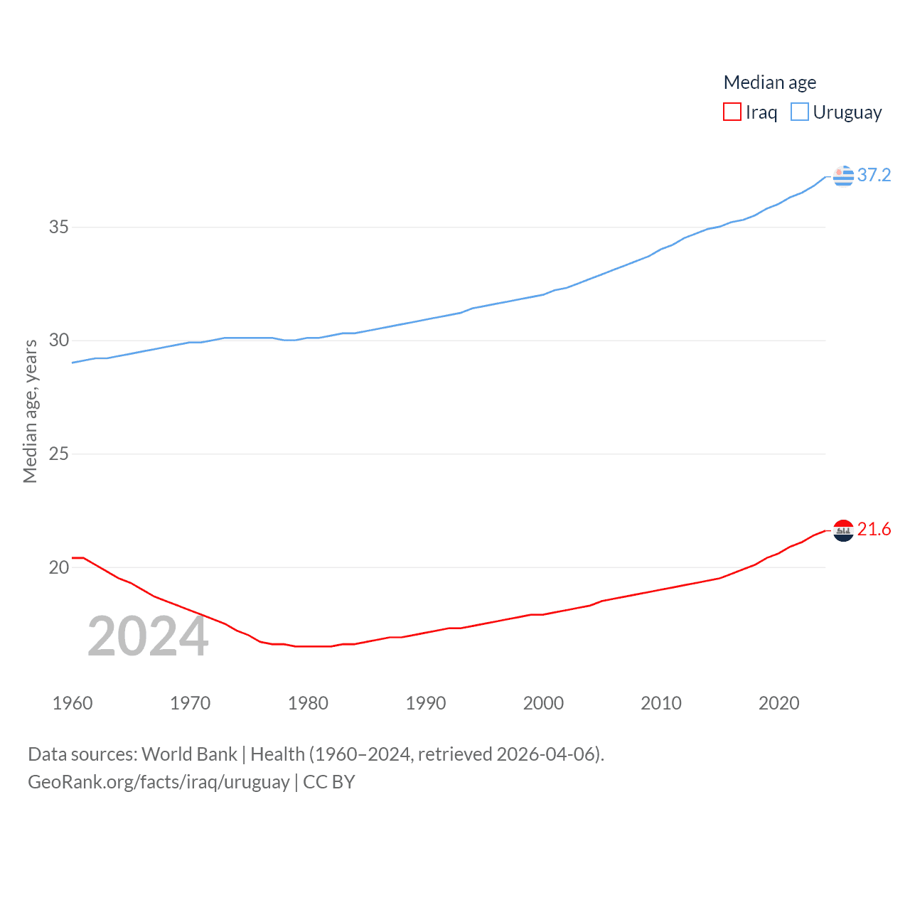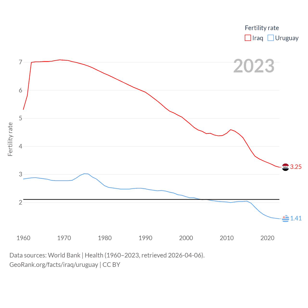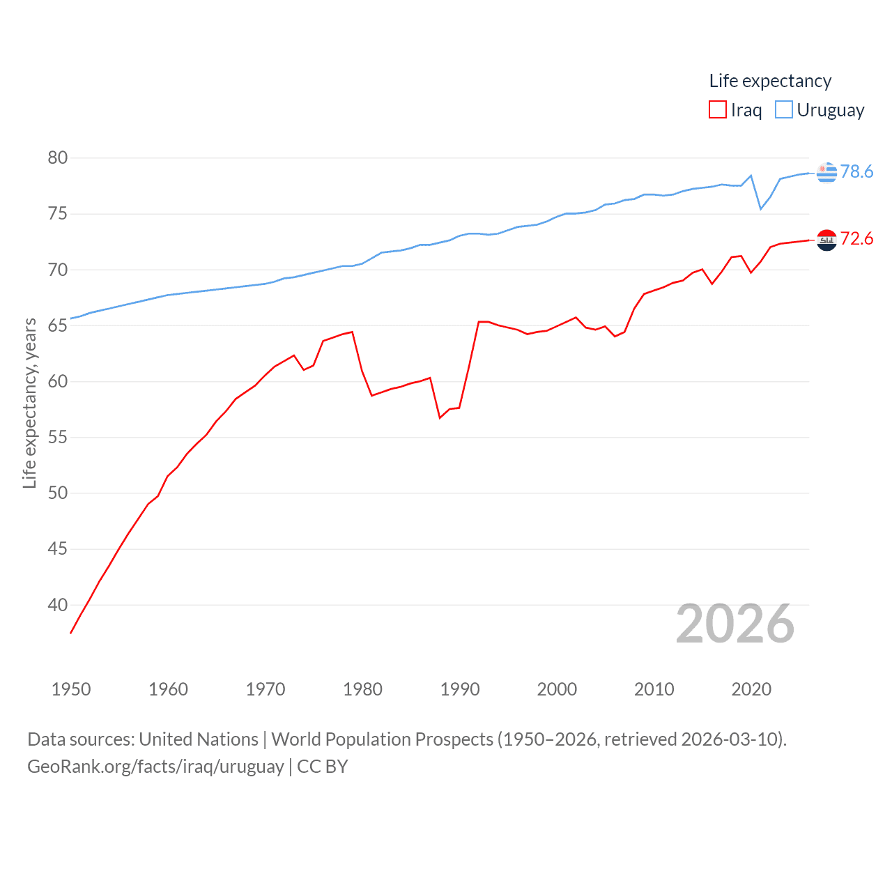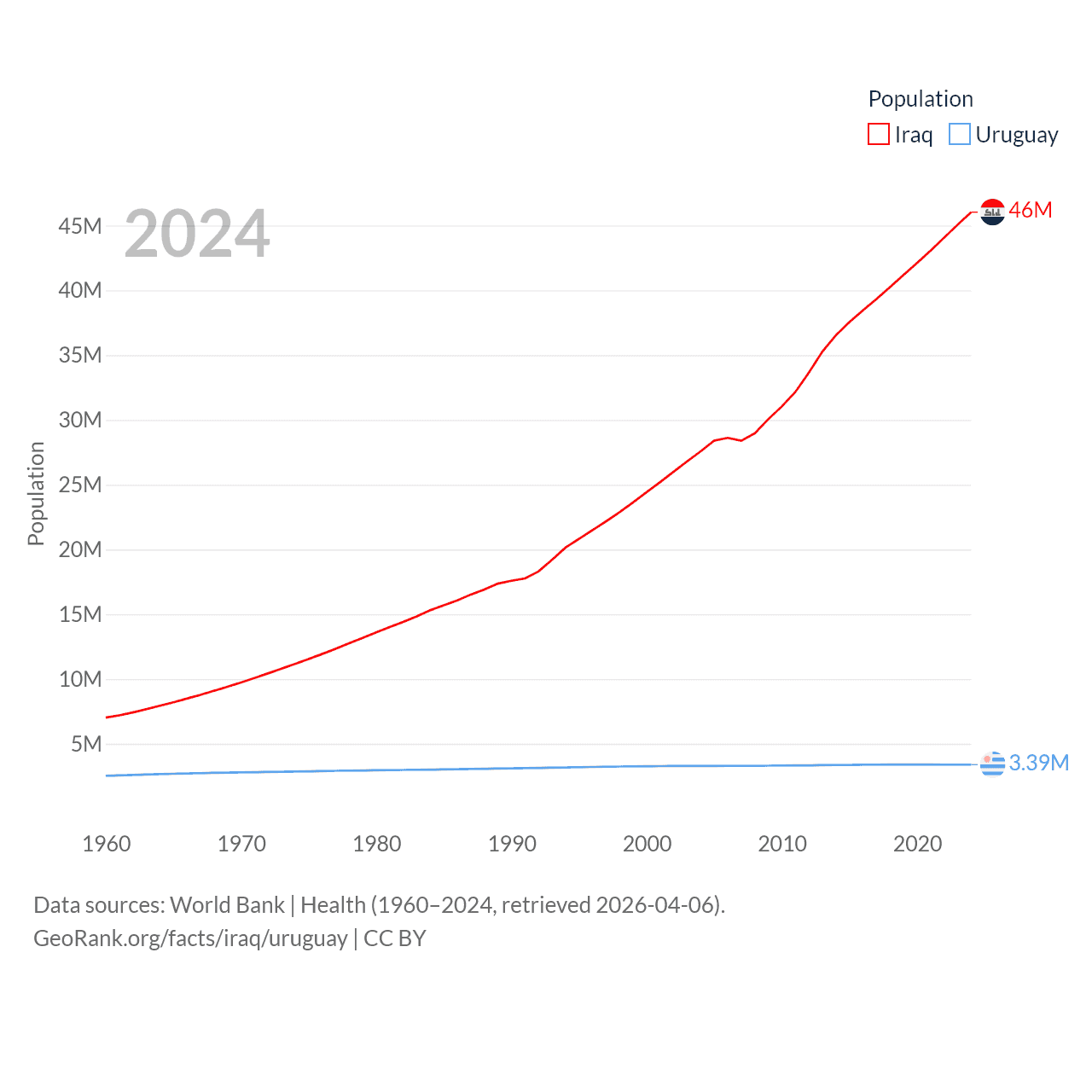 Iraq has a population of 46M (ranked 34/197), compared with 3.39M in Uruguay (ranked 133/197). Iraq's land area is 167,619 sq mi versus 67,576 sq mi for Uruguay (ranked 57th vs. 89th).