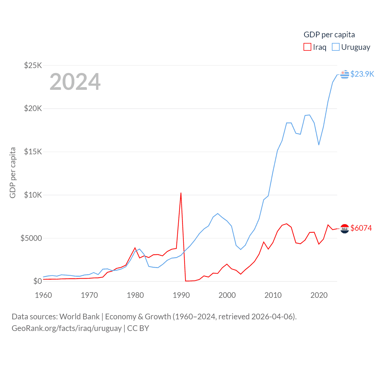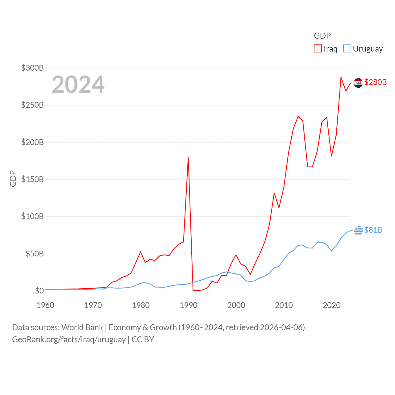 By GDP, Iraq ranks 50/197 ($280B) and Uruguay ranks 81/197 ($81B). By GDP per capita, Iraq ranks 113/197 ($6,074), while Uruguay ranks 52/197 ($23,907).