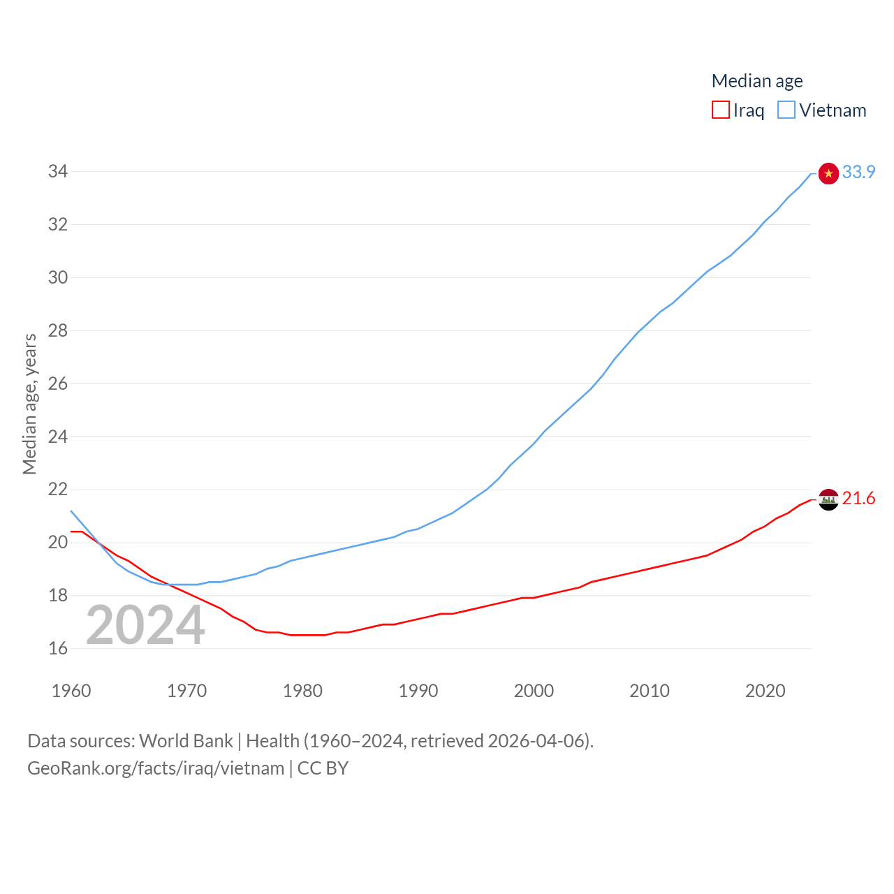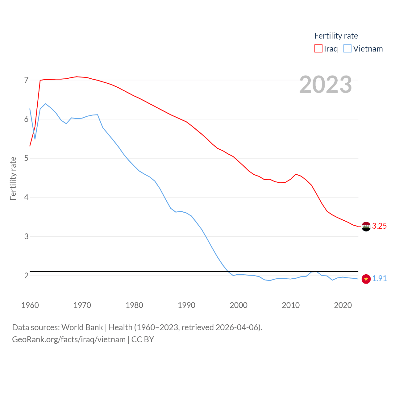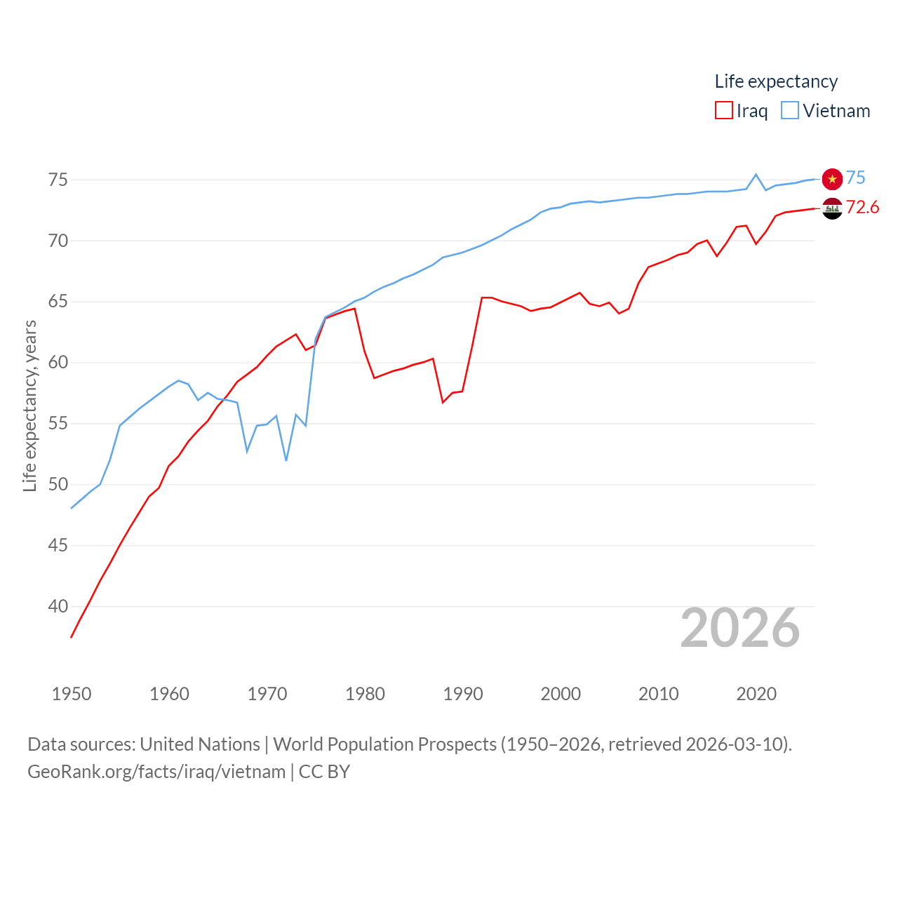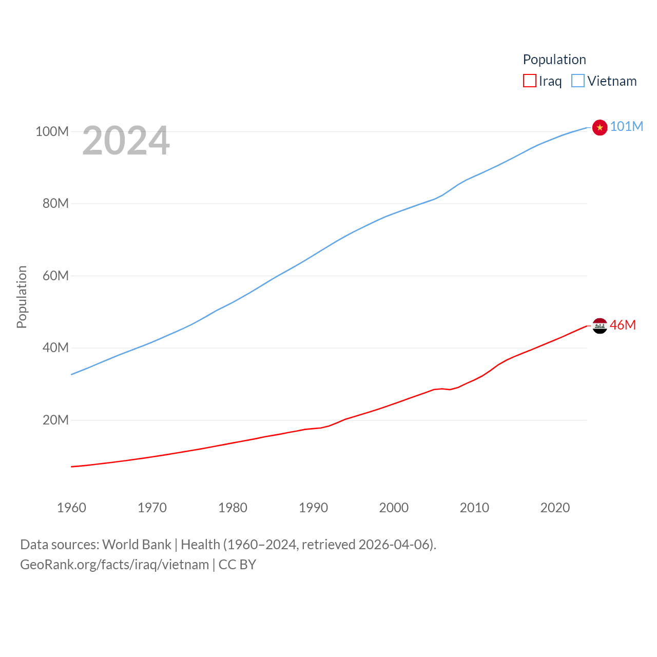 Iraq has a population of 46M (ranked 34/197), compared with 101M in Vietnam (ranked 16/197). Iraq's land area is 167,619 sq mi versus 121,016 sq mi for Vietnam (ranked 57th vs. 67th).