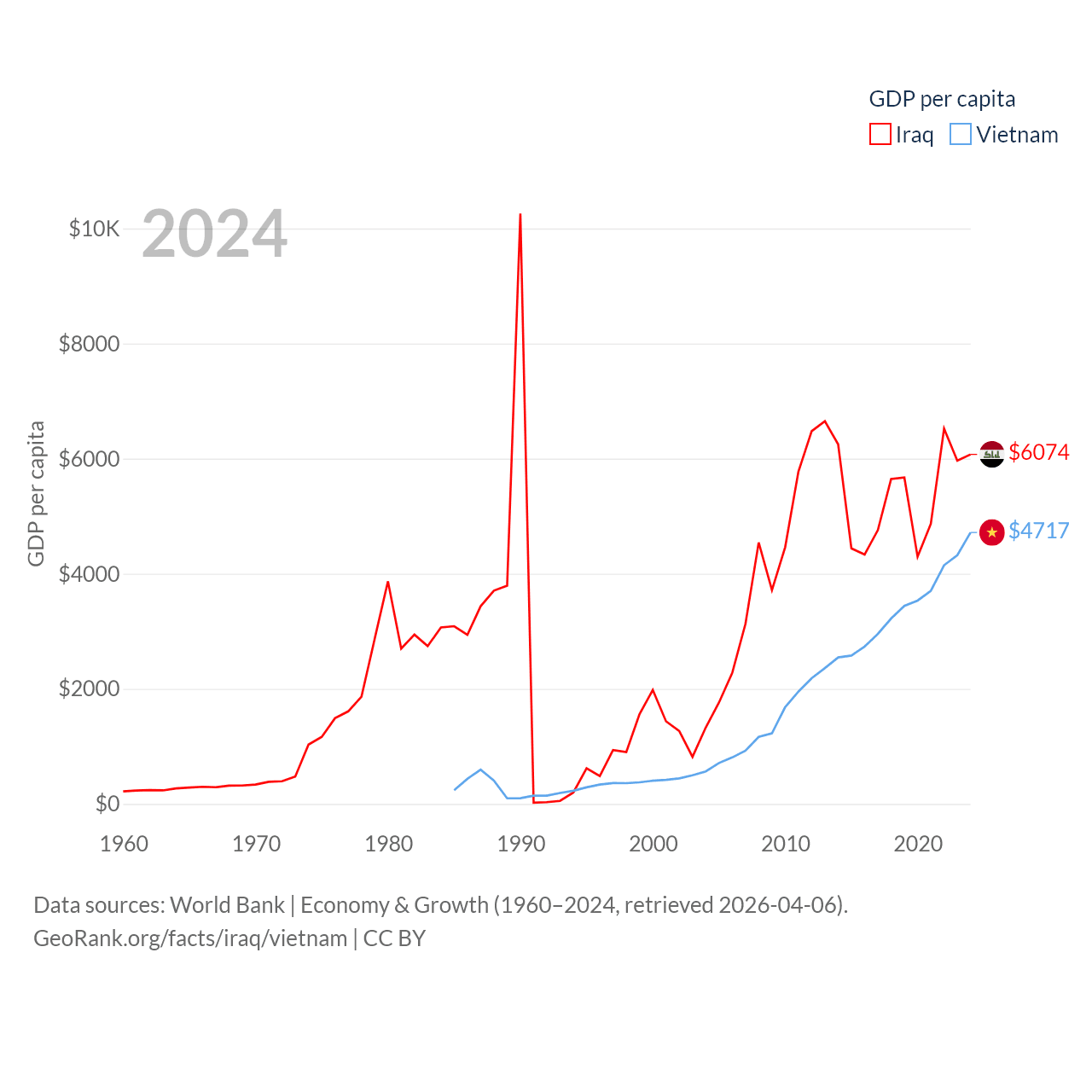 By GDP, Iraq ranks 50/197 ($280B) and Vietnam ranks 33/197 ($476B). By GDP per capita, Iraq ranks 113/197 ($6,074), while Vietnam ranks 122/197 ($4,717).