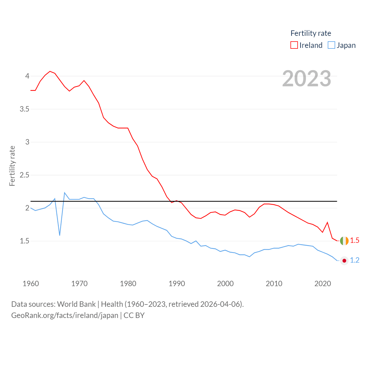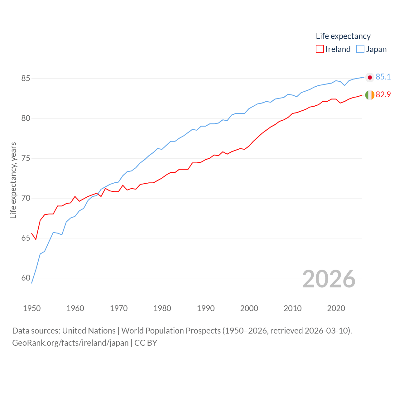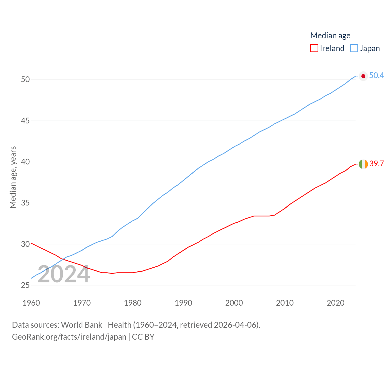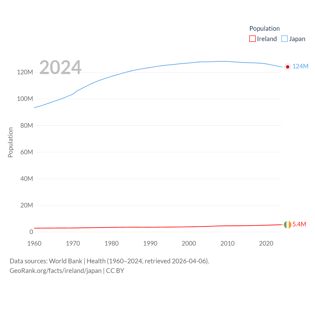 Ireland has a population of 5.4M (ranked 120/197), compared with 124M in Japan (ranked 12/197). Ireland's land area is 26,599 sq mi versus 140,761 sq mi for Japan (ranked 119th vs. 61st).
