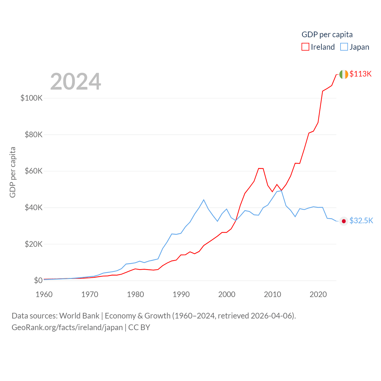 By GDP, Ireland ranks 25/197 ($609B) and Japan ranks 4/197 ($4.03T). By GDP per capita, Ireland ranks 4/197 ($112,895), while Japan ranks 38/197 ($32,487).