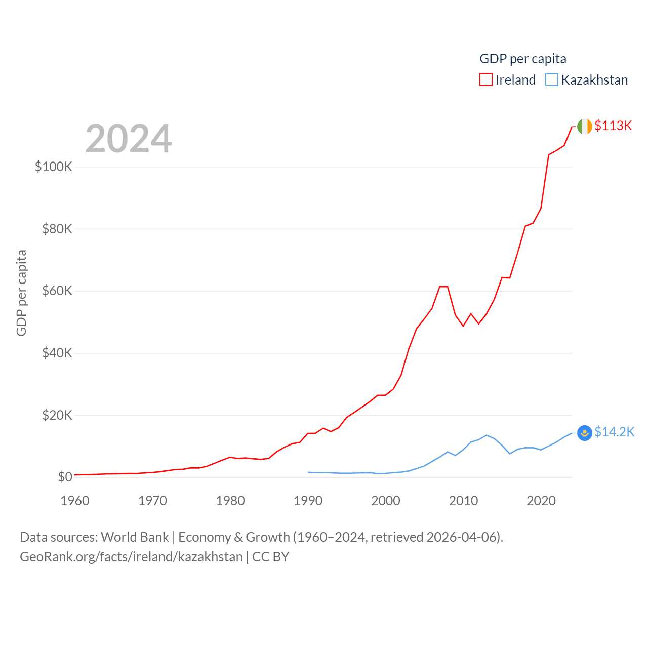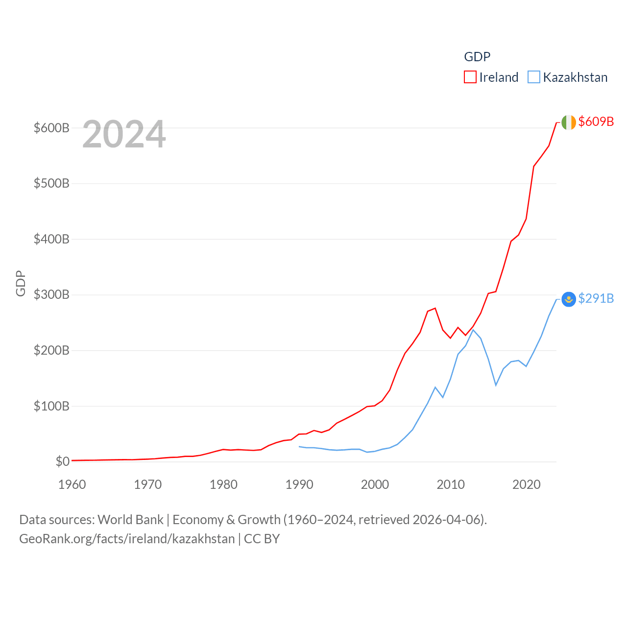 By GDP, Ireland ranks 25/197 ($609B) and Kazakhstan ranks 48/197 ($291B). By GDP per capita, Ireland ranks 4/197 ($112,895), while Kazakhstan ranks 71/197 ($14,155).