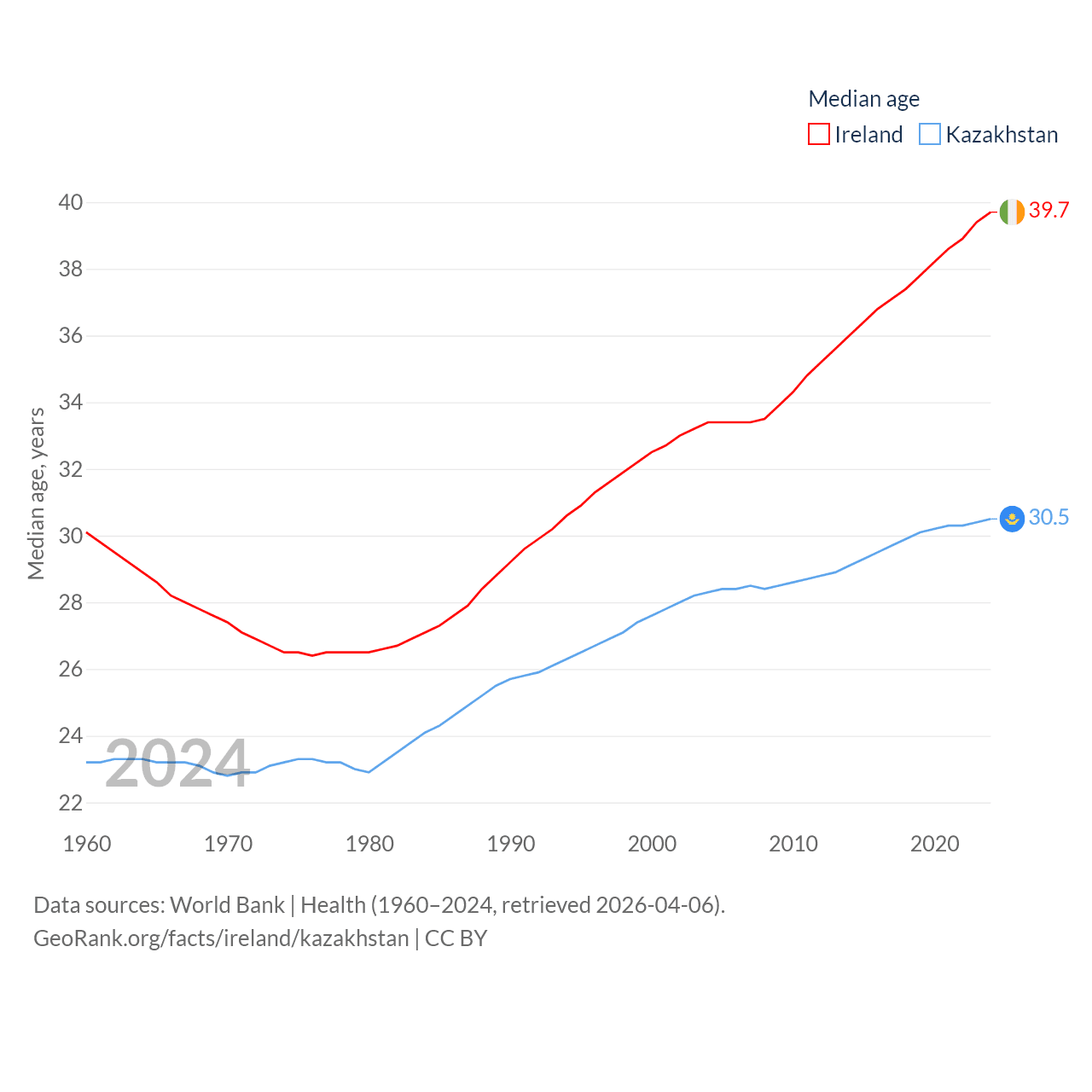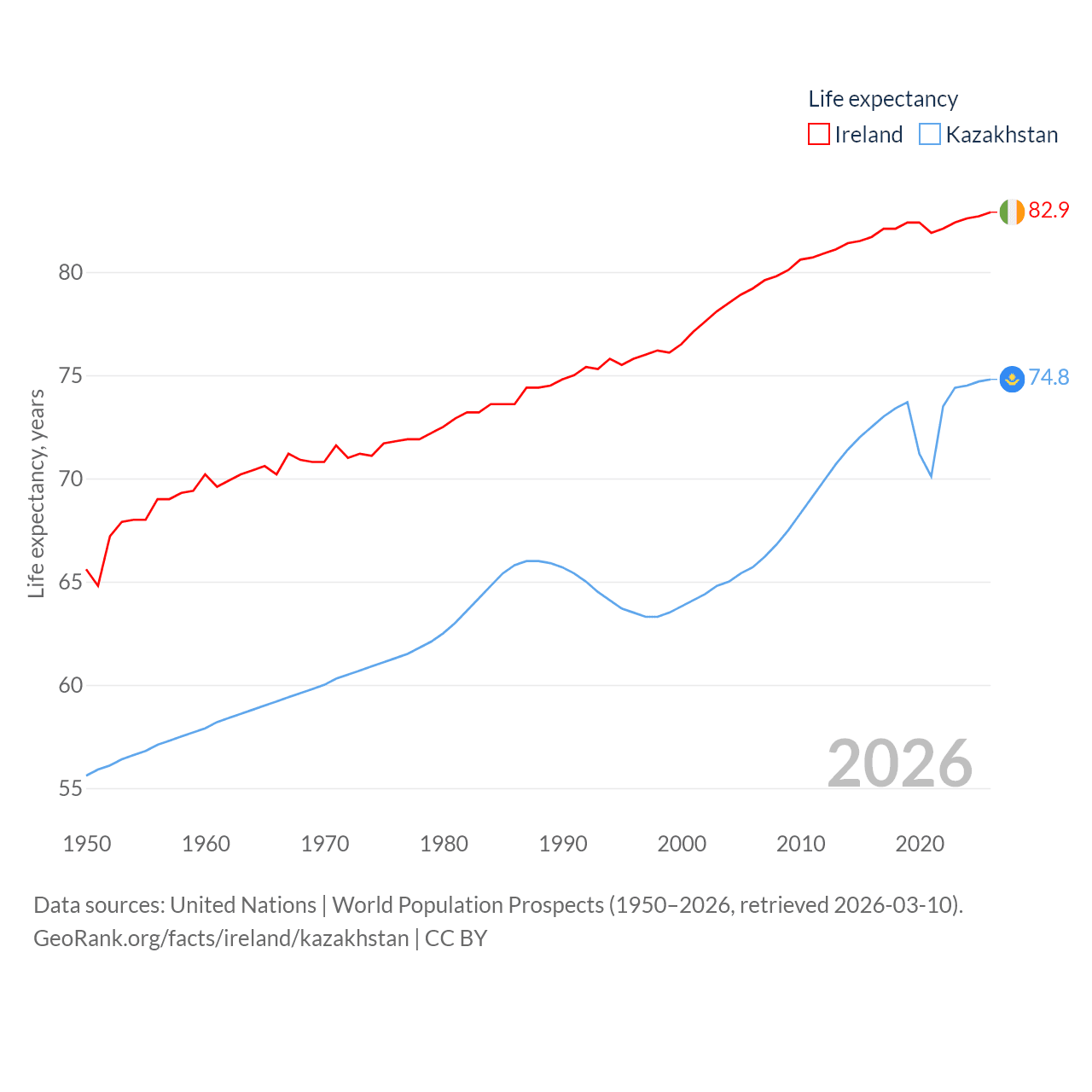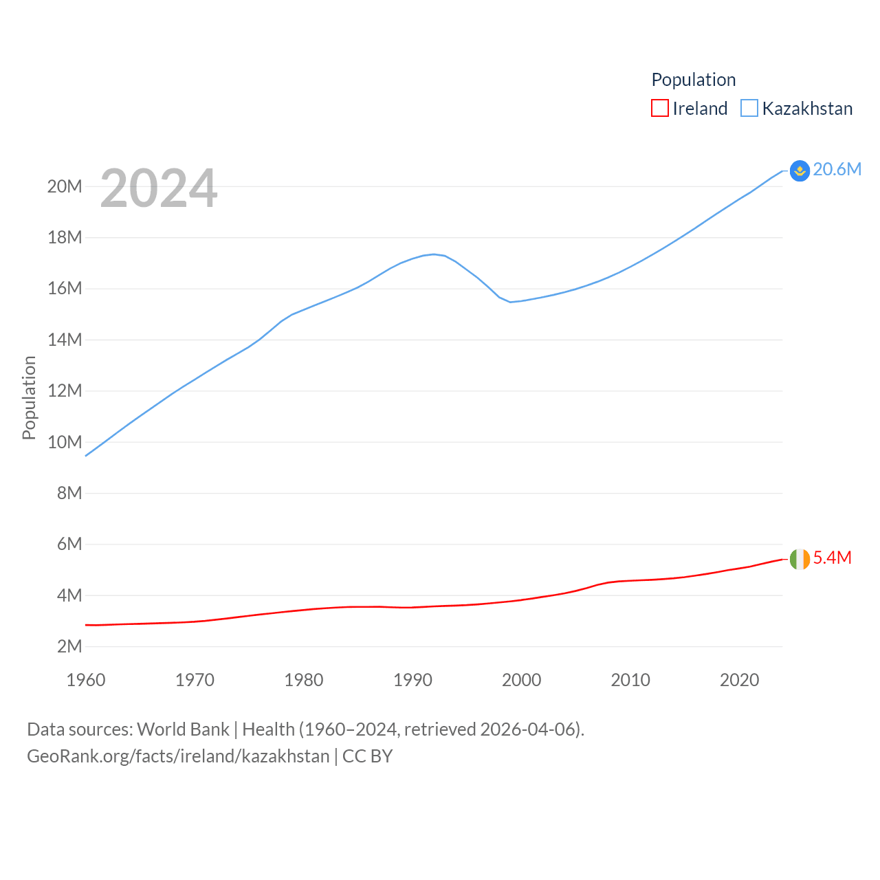 Ireland has a population of 5.4M (ranked 120/197), compared with 20.6M in Kazakhstan (ranked 64/197). Ireland's land area is 26,599 sq mi versus 1,042,360 sq mi for Kazakhstan (ranked 119th vs. 9th).
