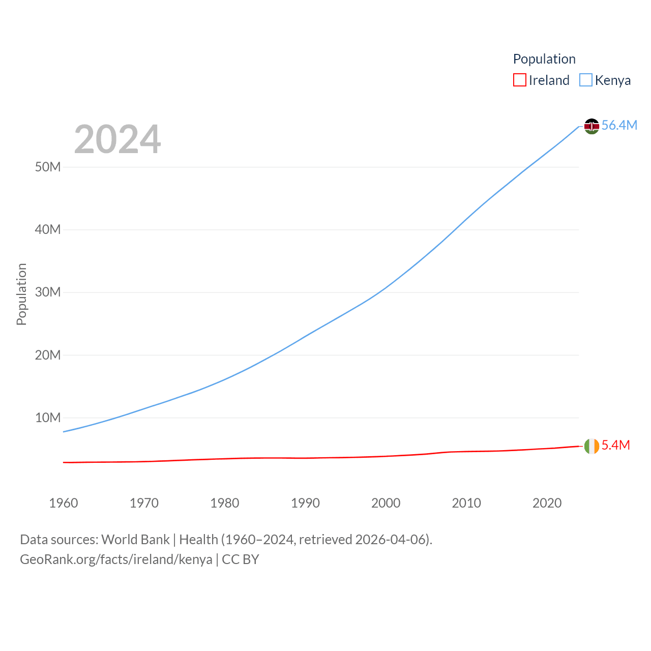 Ireland has a population of 5.4M (ranked 120/197), compared with 56.4M in Kenya (ranked 26/197). Ireland's land area is 26,599 sq mi versus 224,278 sq mi for Kenya (ranked 119th vs. 45th).