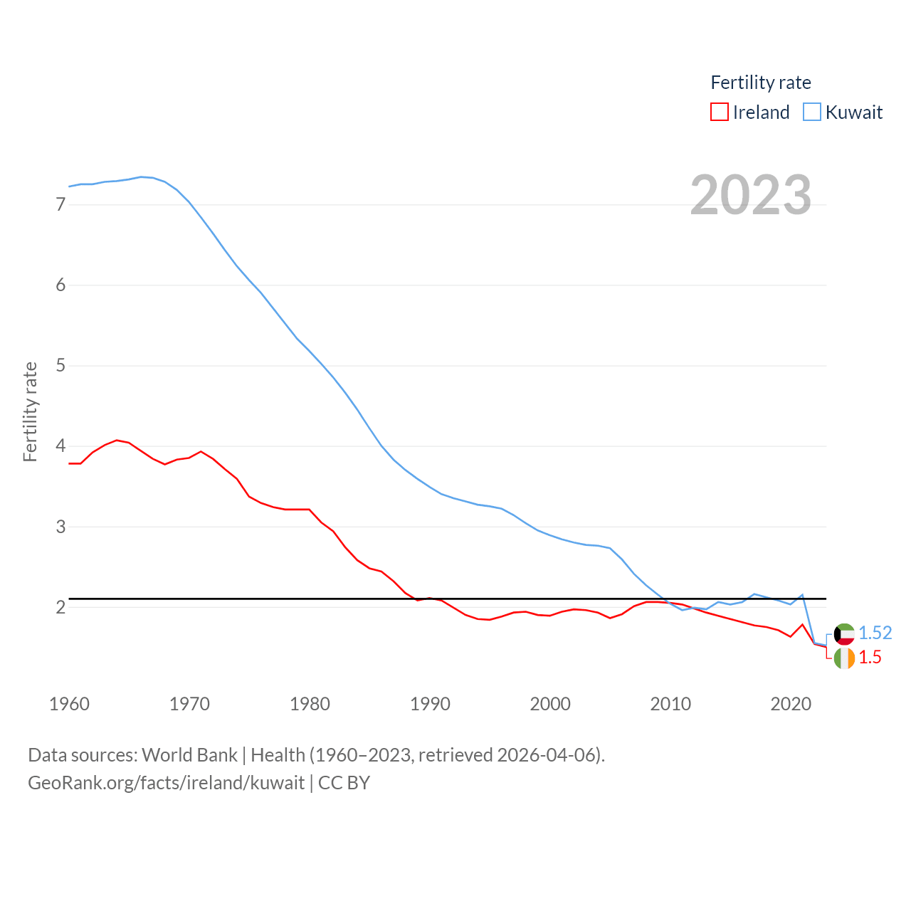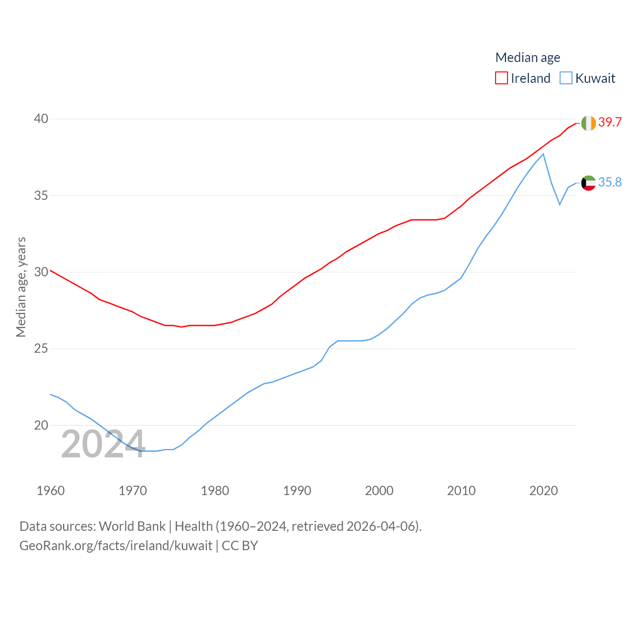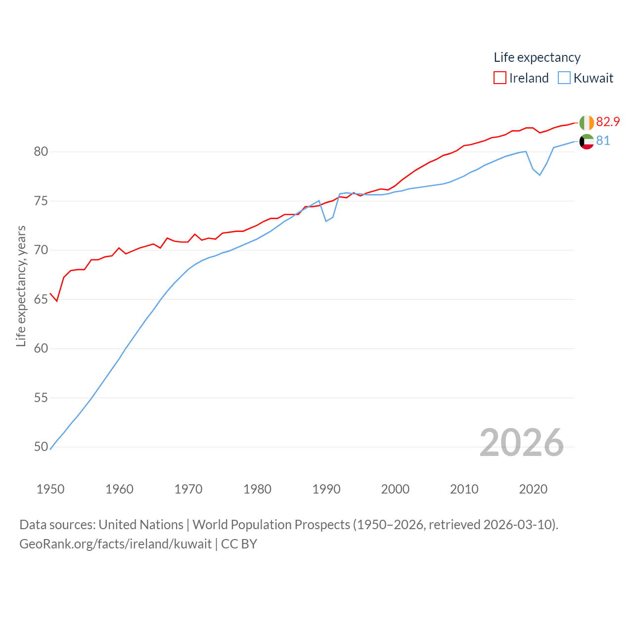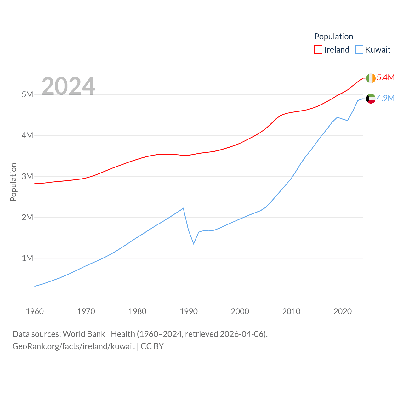 Ireland has a population of 5.4M (ranked 120/197), compared with 4.9M in Kuwait (ranked 127/197). Ireland's land area is 26,599 sq mi versus 6,880 sq mi for Kuwait (ranked 119th vs. 153rd).