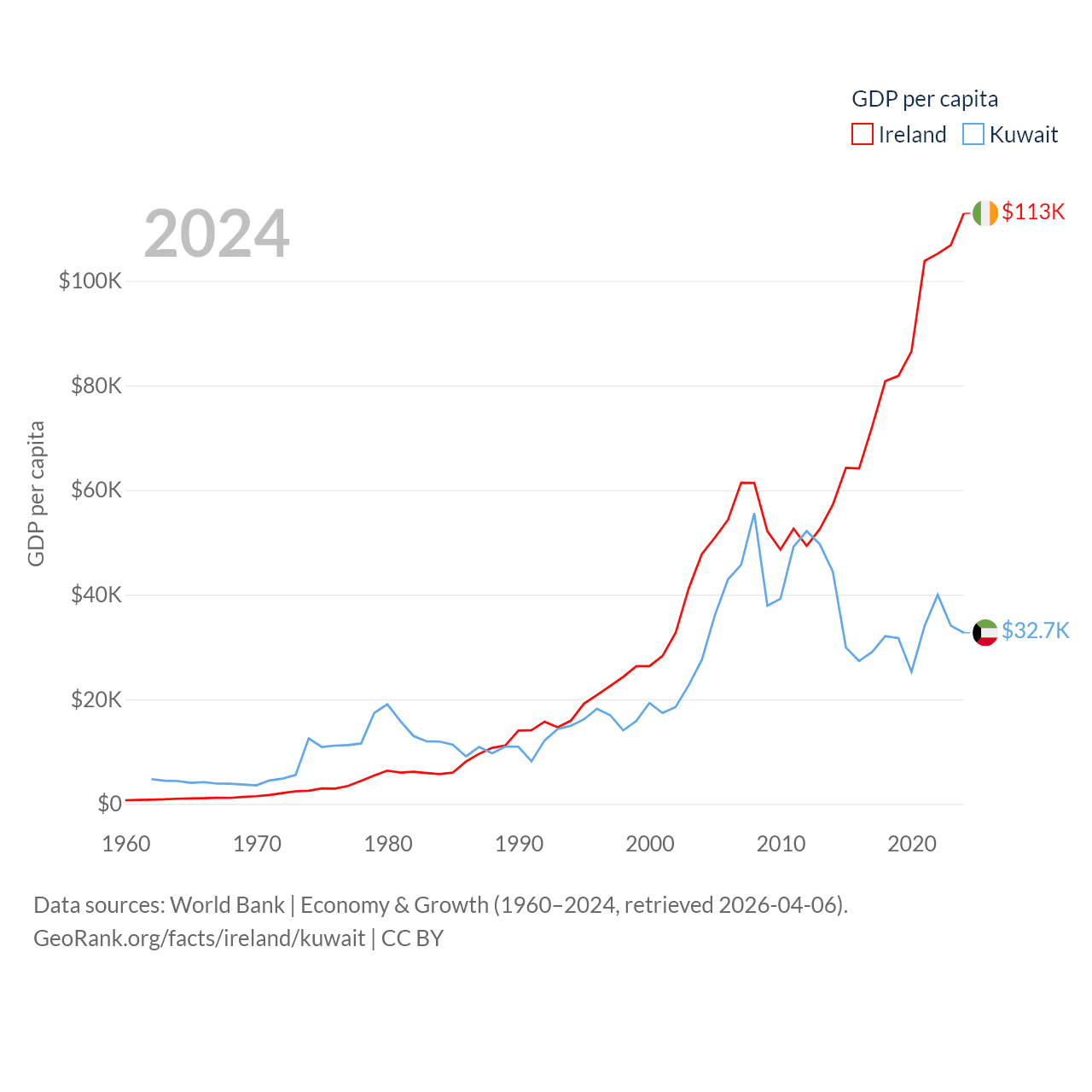 By GDP, Ireland ranks 25/197 ($609B) and Kuwait ranks 59/197 ($160B). By GDP per capita, Ireland ranks 4/197 ($112,895), while Kuwait ranks 37/197 ($32,718).