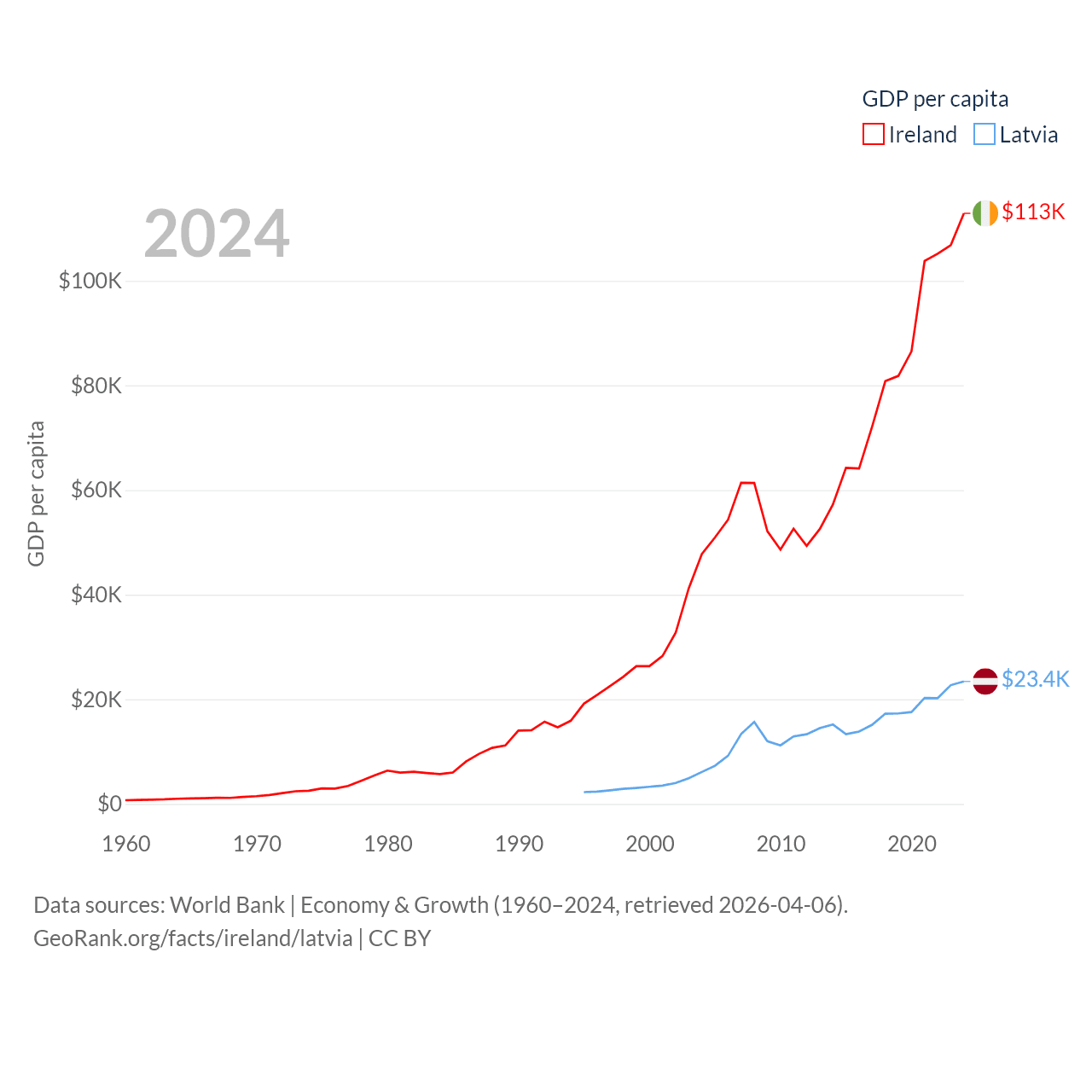 By GDP, Ireland ranks 25/197 ($609B) and Latvia ranks 99/197 ($43.7B). By GDP per capita, Ireland ranks 4/197 ($112,895), while Latvia ranks 54/197 ($23,409).