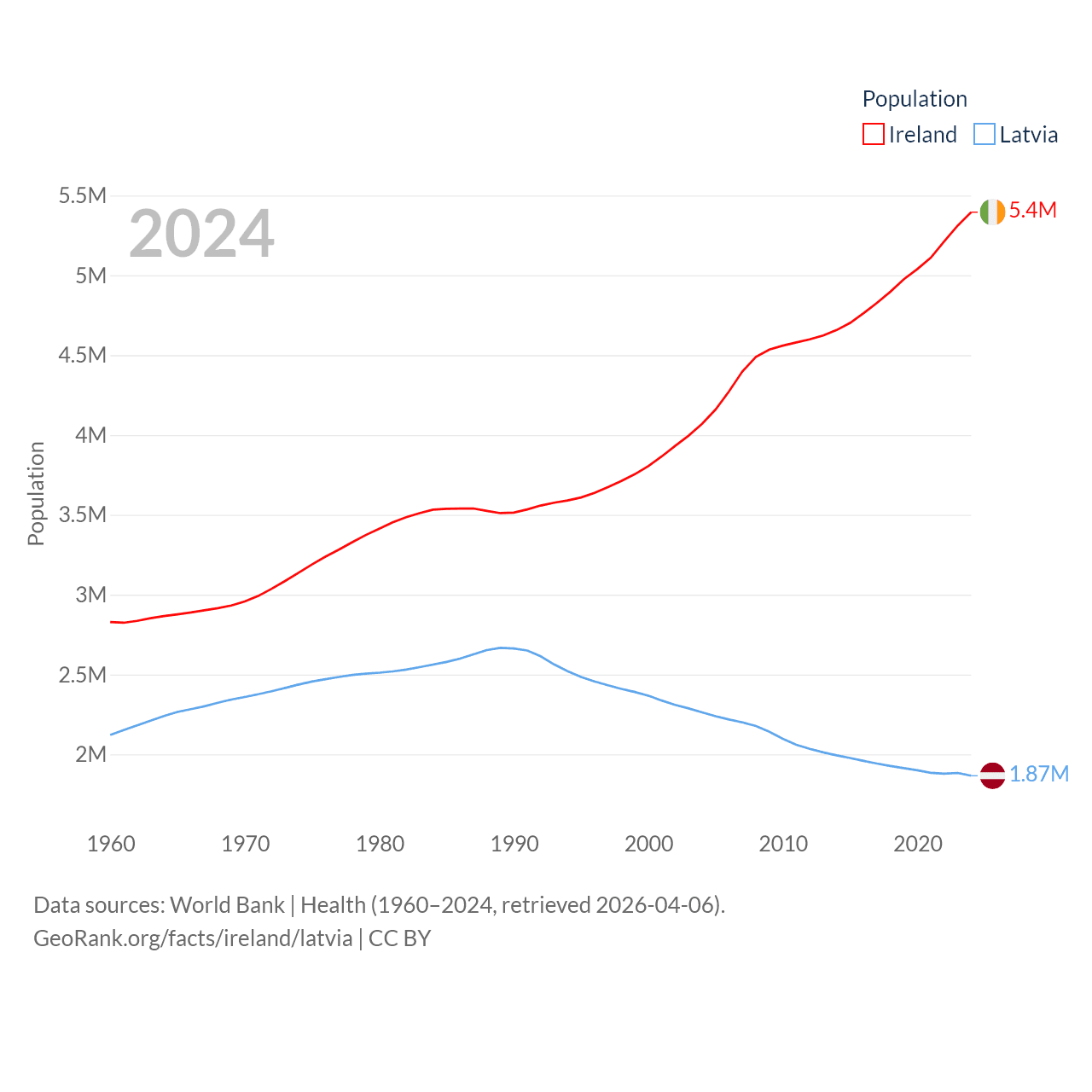 Ireland has a population of 5.4M (ranked 120/197), compared with 1.87M in Latvia (ranked 149/197). Ireland's land area is 26,599 sq mi versus 24,027 sq mi for Latvia (ranked 119th vs. 121st).