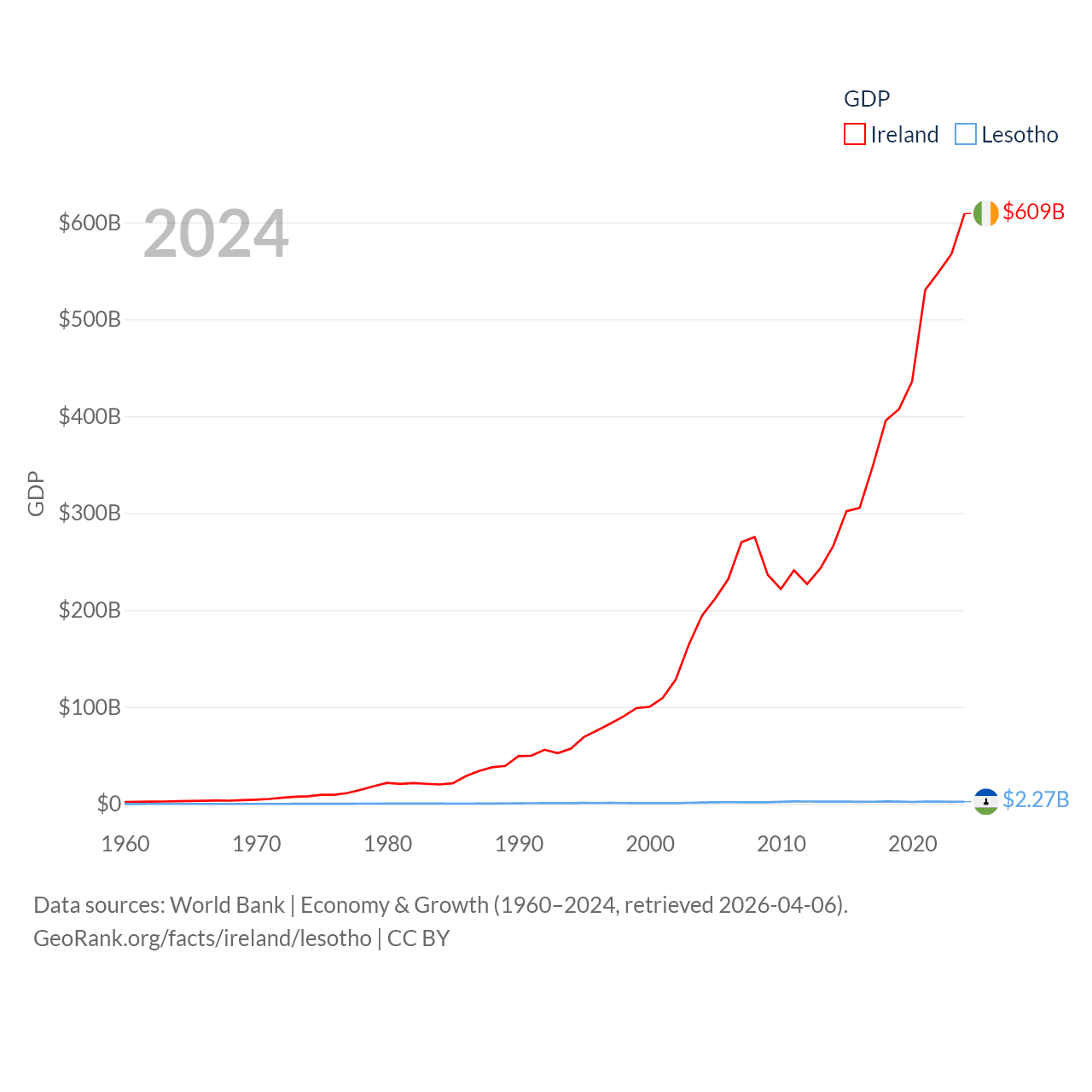 By GDP, Ireland ranks 25/197 ($609B) and Lesotho ranks 175/197 ($2.27B). By GDP per capita, Ireland ranks 4/197 ($112,895), while Lesotho ranks 181/197 ($972).