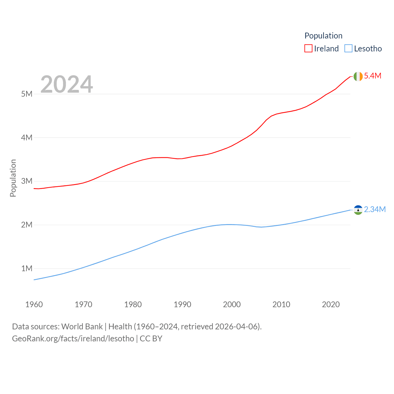 Ireland has a population of 5.4M (ranked 120/197), compared with 2.34M in Lesotho (ranked 145/197). Ireland's land area is 26,599 sq mi versus 11,722 sq mi for Lesotho (ranked 119th vs. 137th).