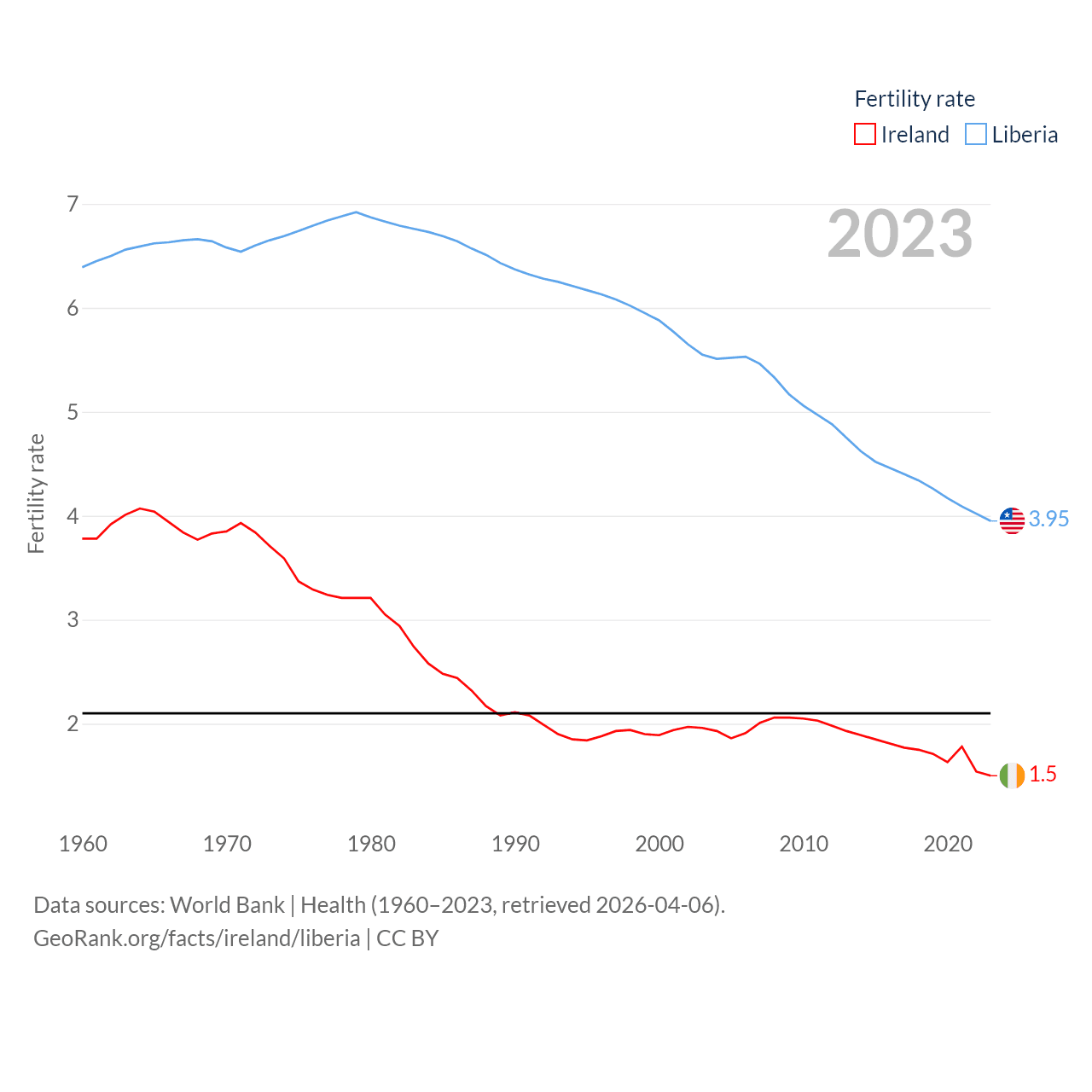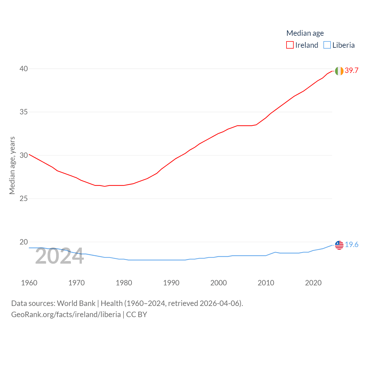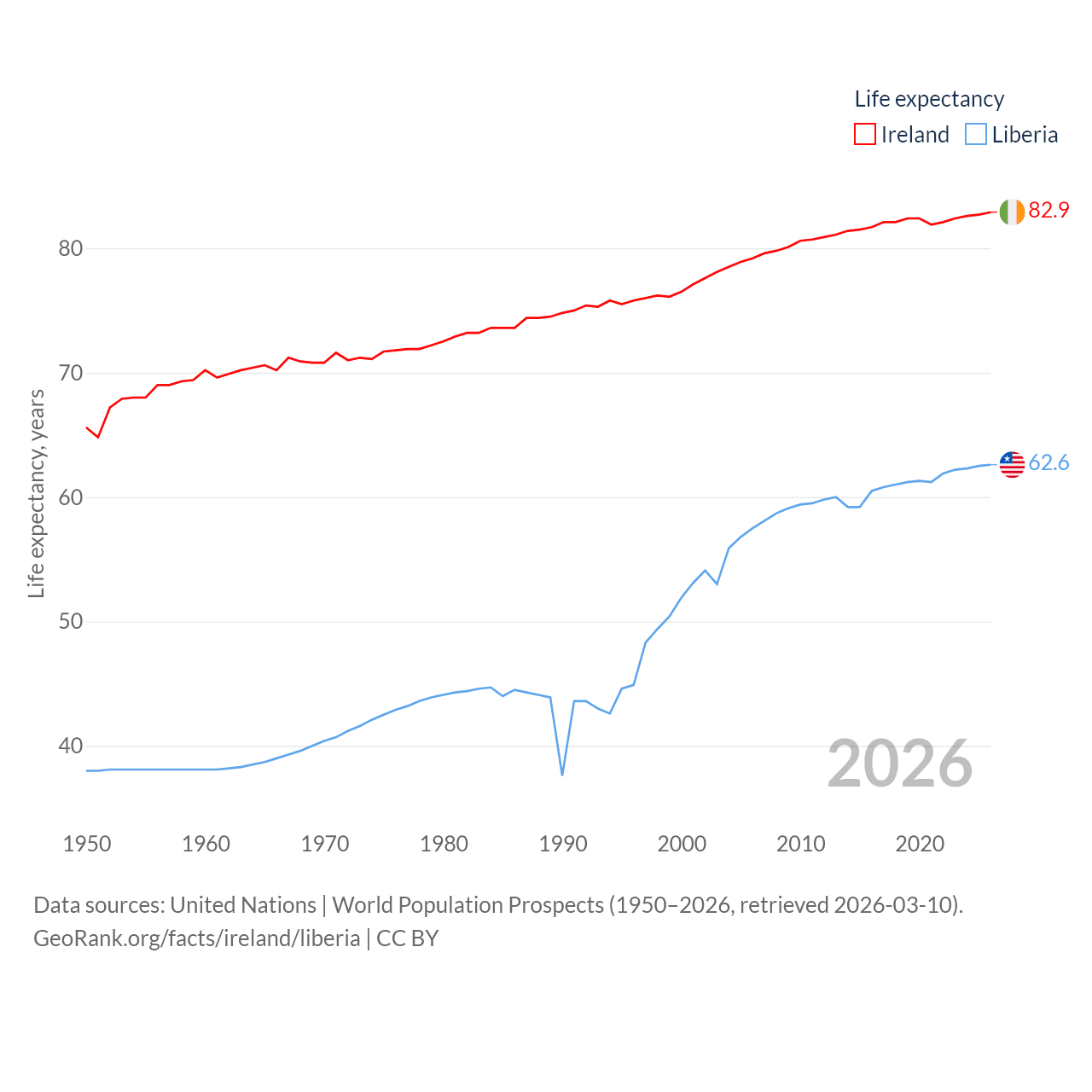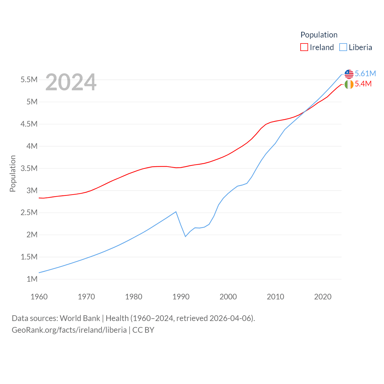 Ireland has a population of 5.4M (ranked 120/197), compared with 5.61M in Liberia (ranked 117/197). Ireland's land area is 26,599 sq mi versus 37,189 sq mi for Liberia (ranked 119th vs. 106th).