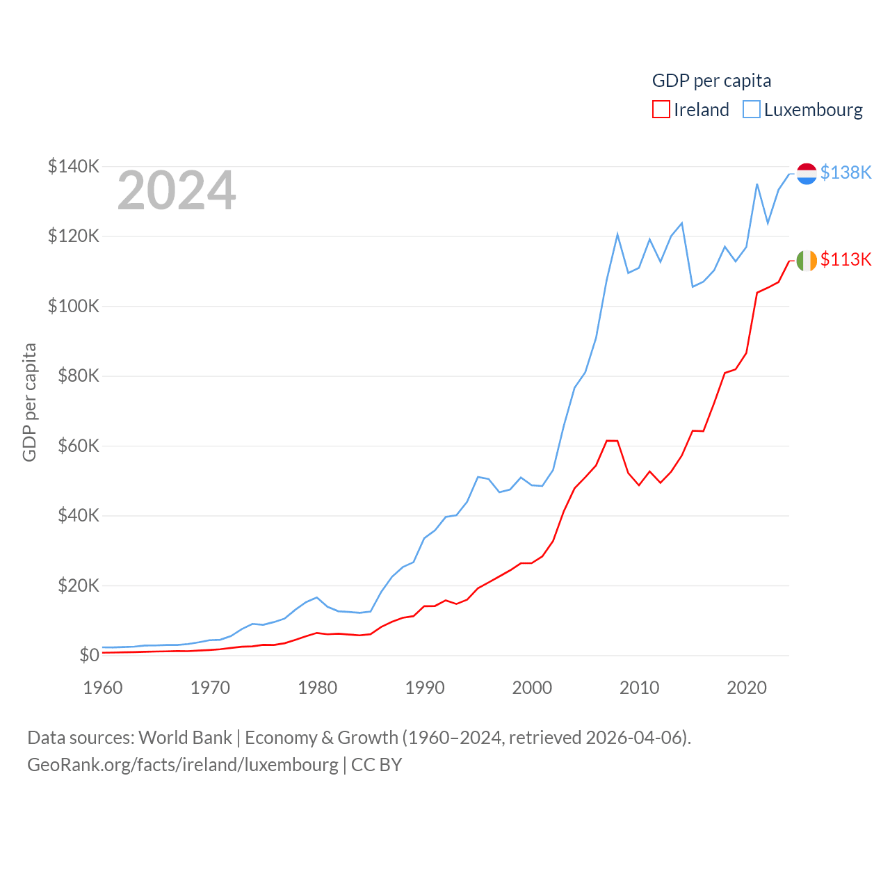 By GDP, Ireland ranks 25/197 ($609B) and Luxembourg ranks 74/197 ($93.3B). By GDP per capita, Ireland ranks 4/197 ($112,895), while Luxembourg ranks 3/197 ($137,782).