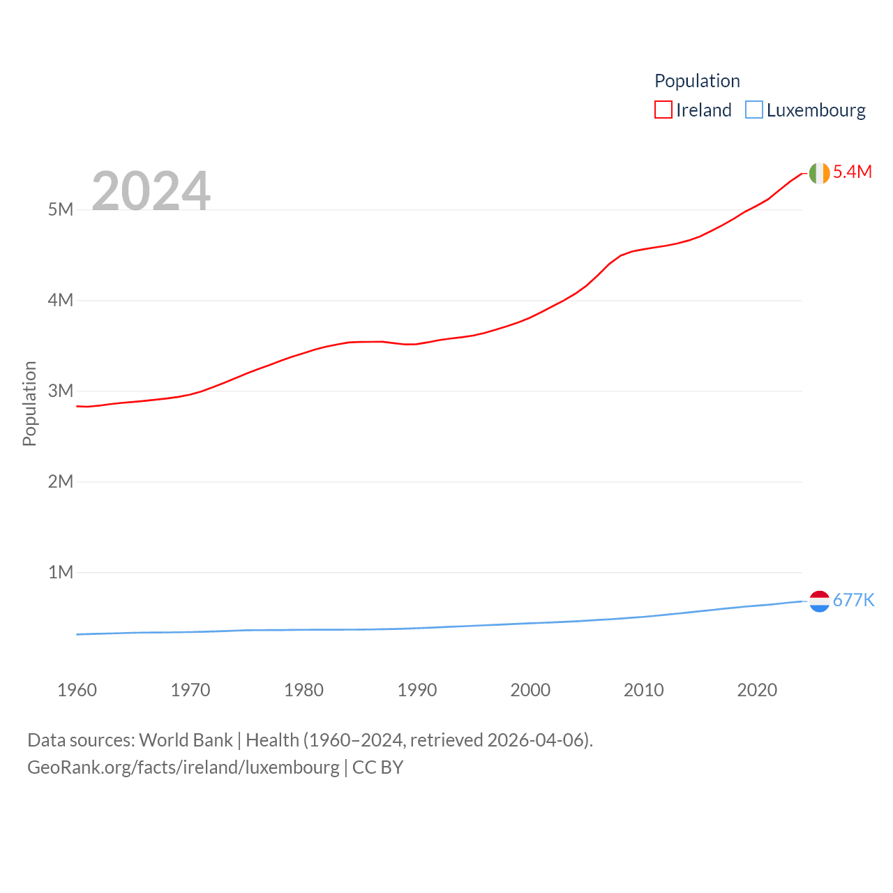 Ireland has a population of 5.4M (ranked 120/197), compared with 677K in Luxembourg (ranked 164/197). Ireland's land area is 26,599 sq mi versus 994 sq mi for Luxembourg (ranked 119th vs. 169th).