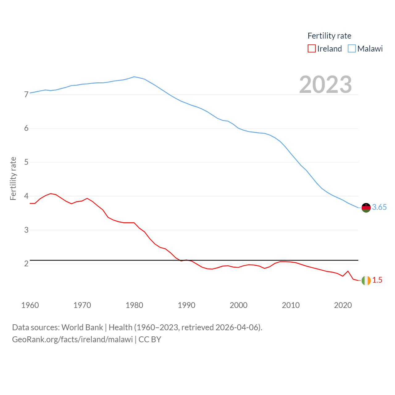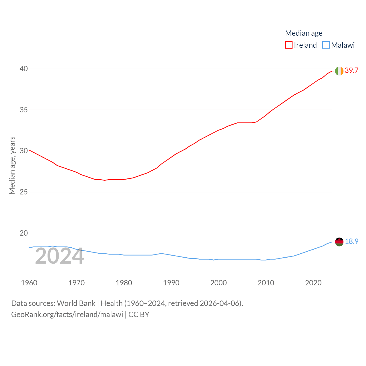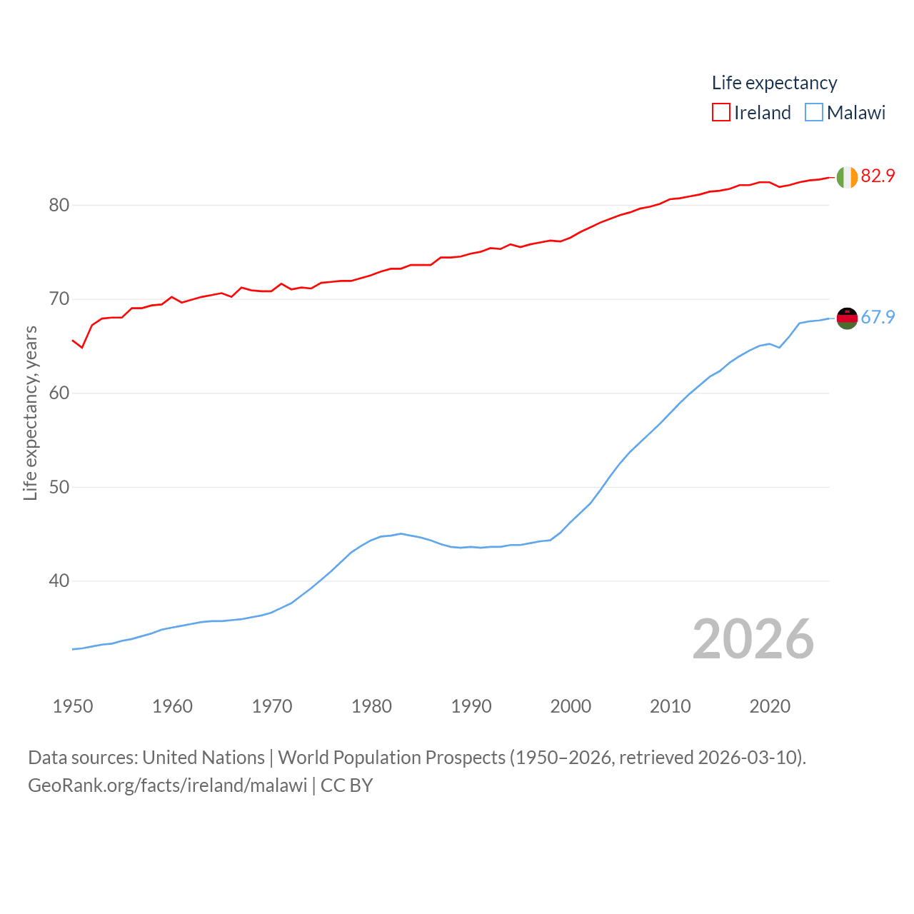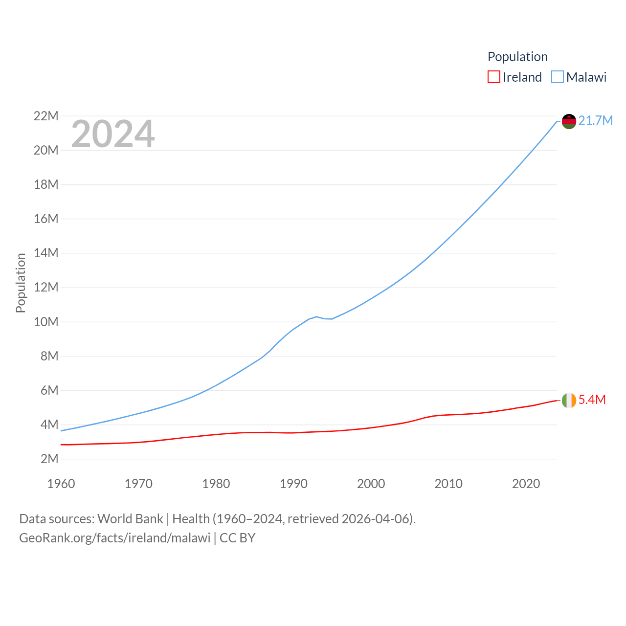 Ireland has a population of 5.4M (ranked 120/197), compared with 21.7M in Malawi (ranked 62/197). Ireland's land area is 26,599 sq mi versus 36,402 sq mi for Malawi (ranked 119th vs. 107th).