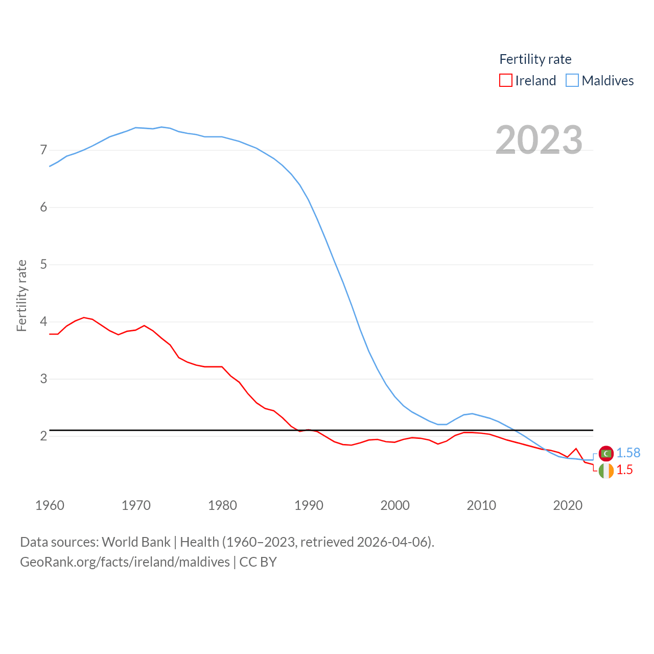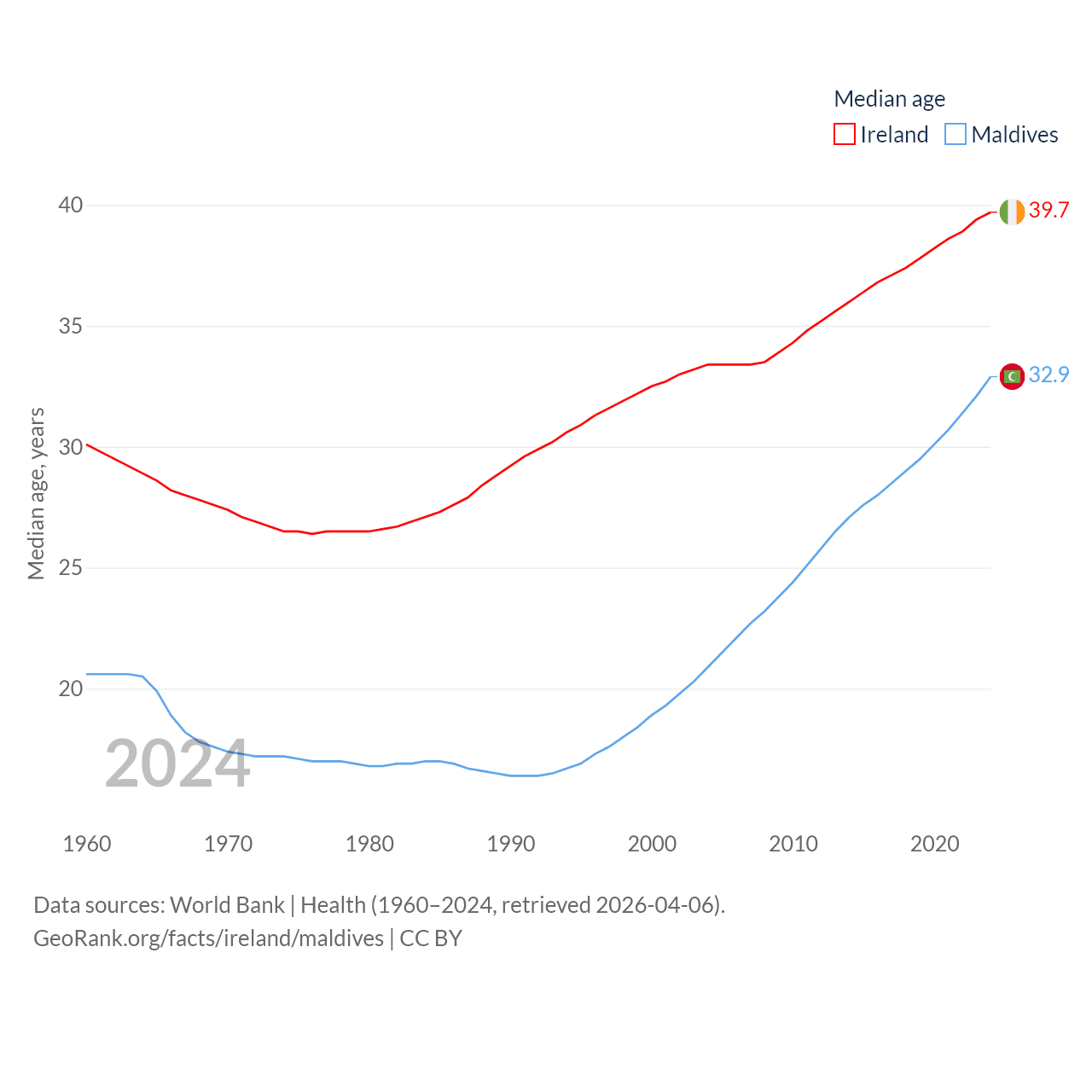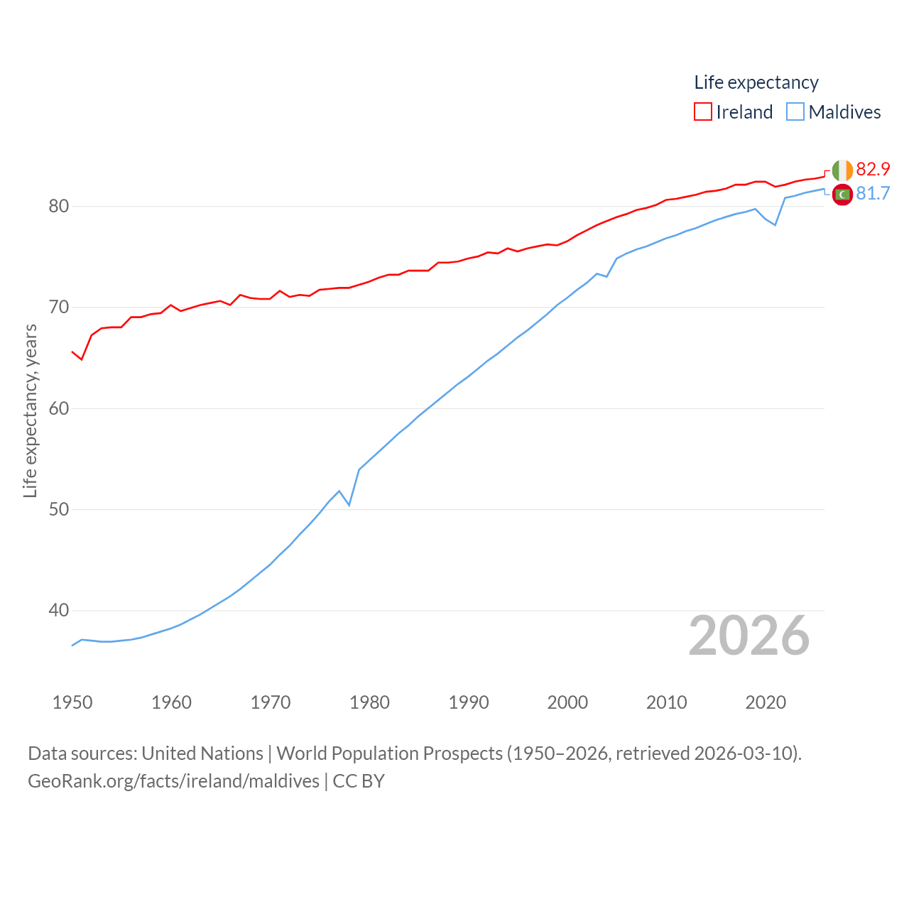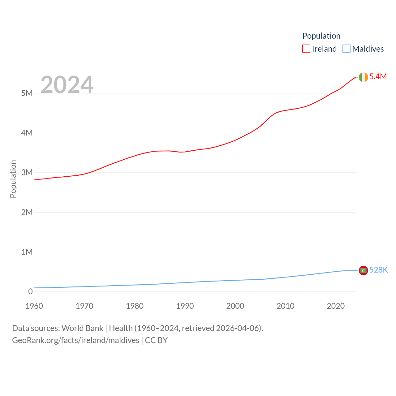 Ireland has a population of 5.4M (ranked 120/197), compared with 528K in Maldives (ranked 168/197). Ireland's land area is 26,599 sq mi versus 115.1 sq mi for Maldives (ranked 119th vs. 188th).