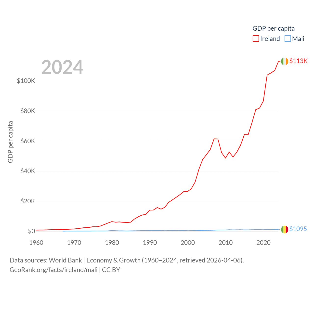 By GDP, Ireland ranks 25/197 ($609B) and Mali ranks 113/197 ($26.8B). By GDP per capita, Ireland ranks 4/197 ($112,895), while Mali ranks 173/197 ($1,095).