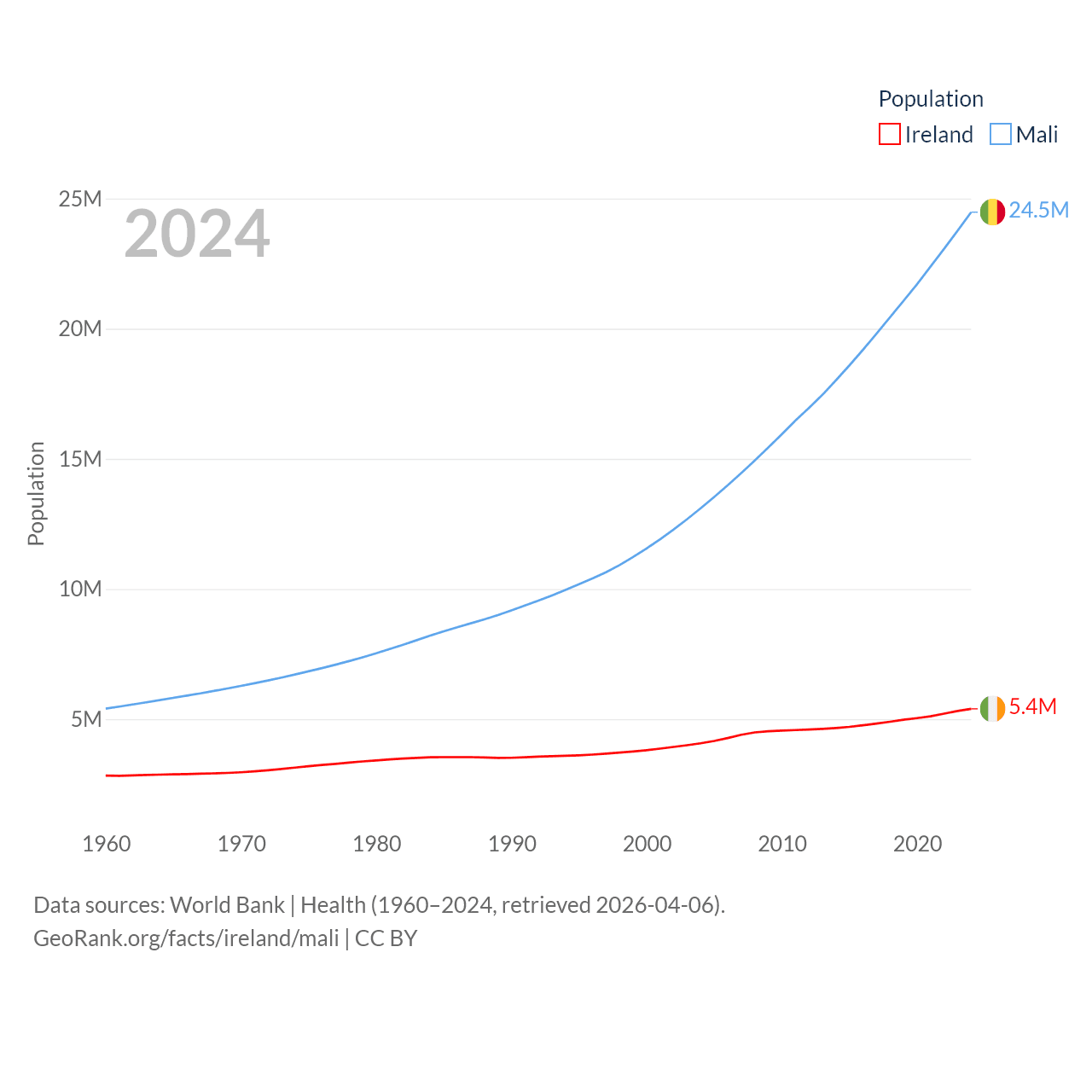 Ireland has a population of 5.4M (ranked 120/197), compared with 24.5M in Mali (ranked 58/197). Ireland's land area is 26,599 sq mi versus 471,118 sq mi for Mali (ranked 119th vs. 23rd).