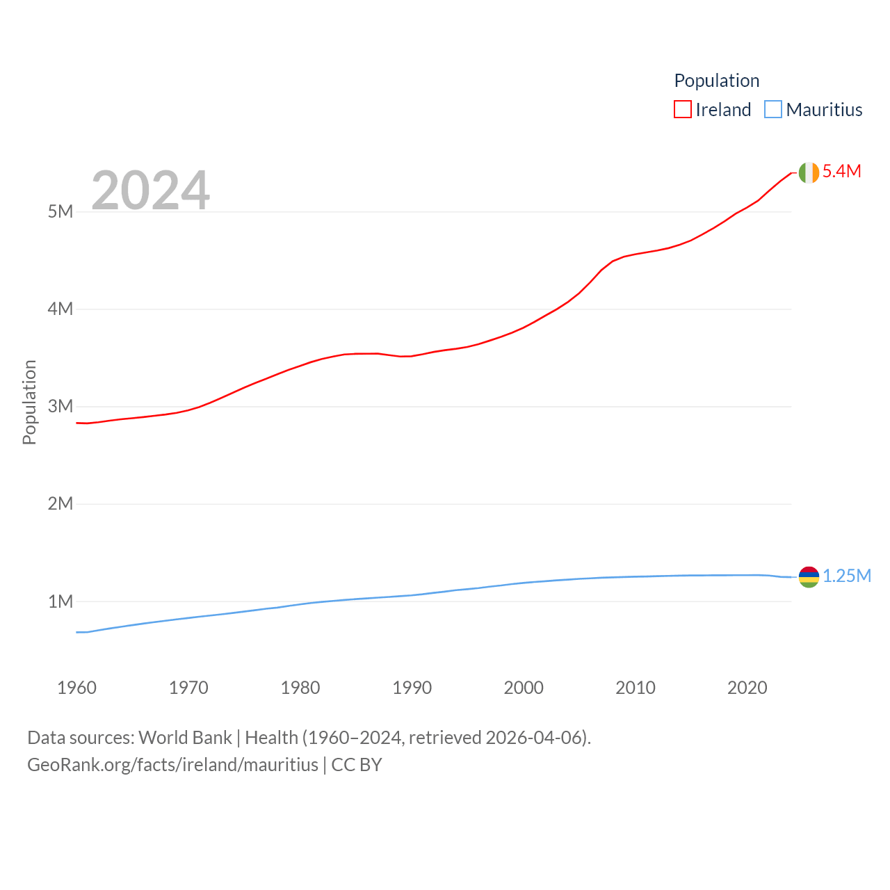 Ireland has a population of 5.4M (ranked 120/197), compared with 1.25M in Mauritius (ranked 156/197). Ireland's land area is 26,599 sq mi versus 771 sq mi for Mauritius (ranked 119th vs. 170th).
