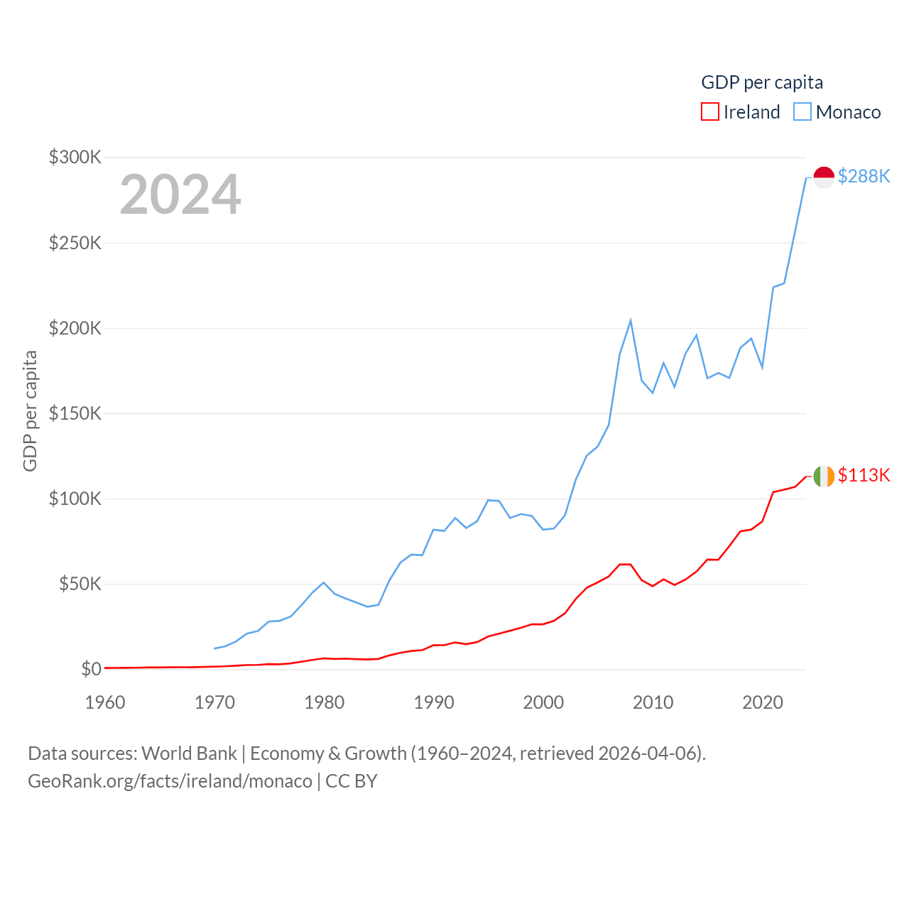 By GDP, Ireland ranks 25/197 ($609B) and Monaco ranks 152/197 ($11.1B). By GDP per capita, Ireland ranks 4/197 ($112,895), while Monaco ranks 1/197 ($288,001).