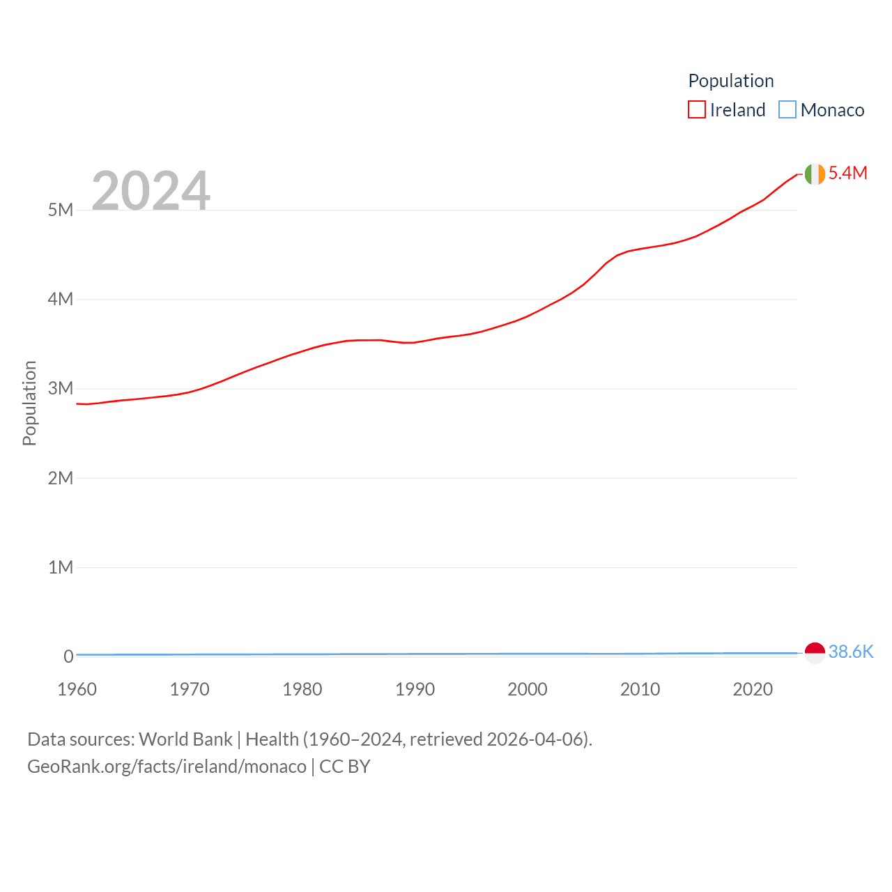 Ireland has a population of 5.4M (ranked 120/197), compared with 38.6K in Monaco (ranked 191/197). Ireland's land area is 26,599 sq mi versus 0.8 sq mi for Monaco (ranked 119th vs. 196th).