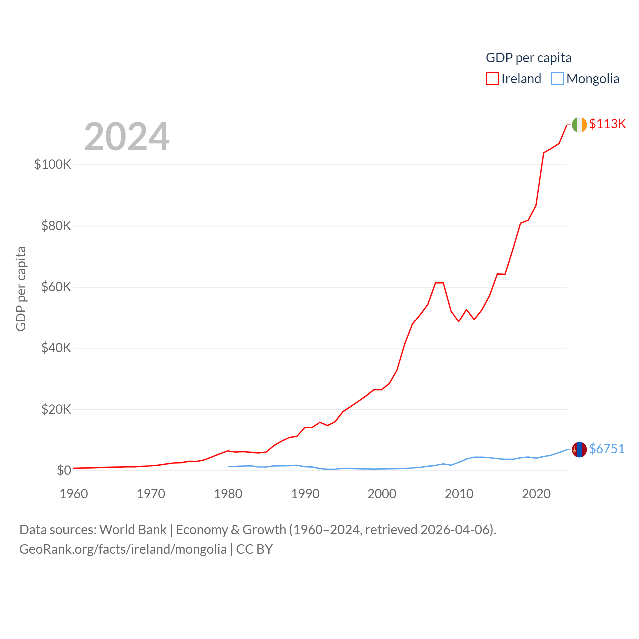 By GDP, Ireland ranks 25/197 ($609B) and Mongolia ranks 121/197 ($23.8B). By GDP per capita, Ireland ranks 4/197 ($112,895), while Mongolia ranks 105/197 ($6,751).