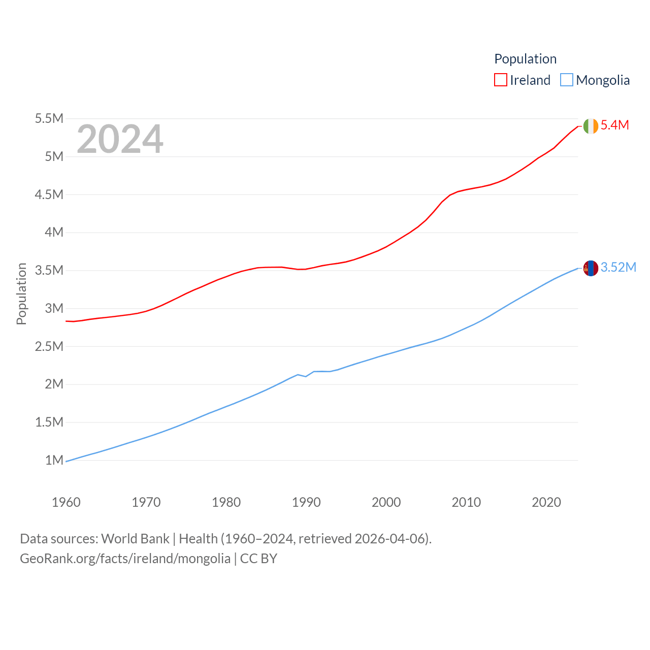 Ireland has a population of 5.4M (ranked 120/197), compared with 3.52M in Mongolia (ranked 132/197). Ireland's land area is 26,599 sq mi versus 601,740 sq mi for Mongolia (ranked 119th vs. 18th).