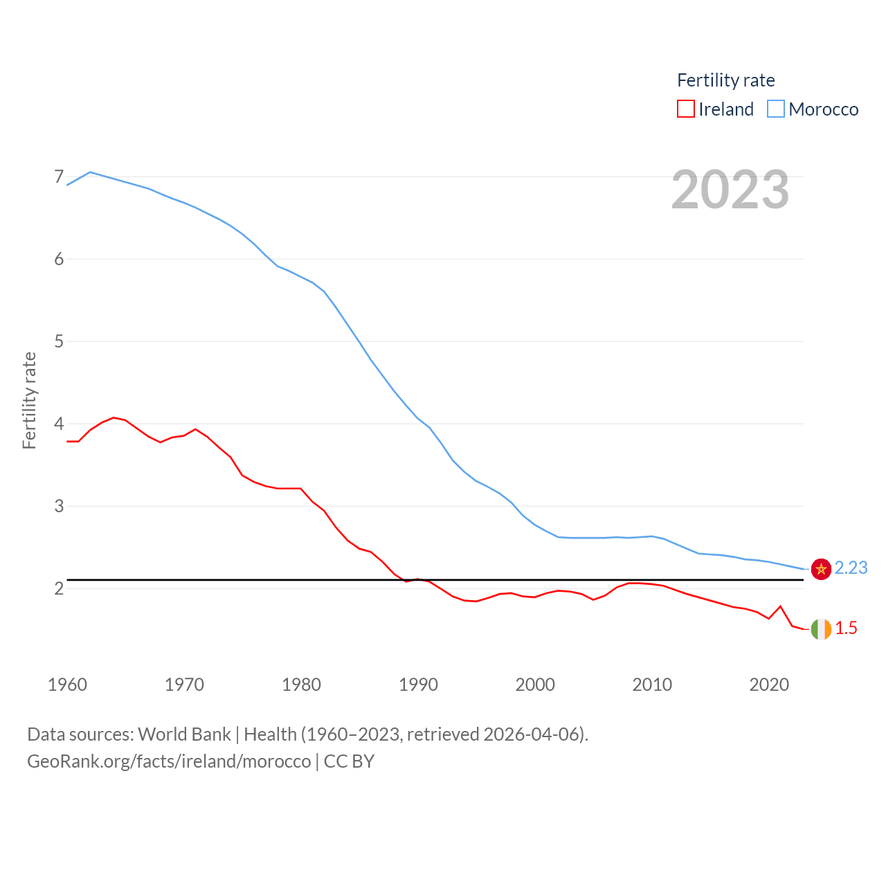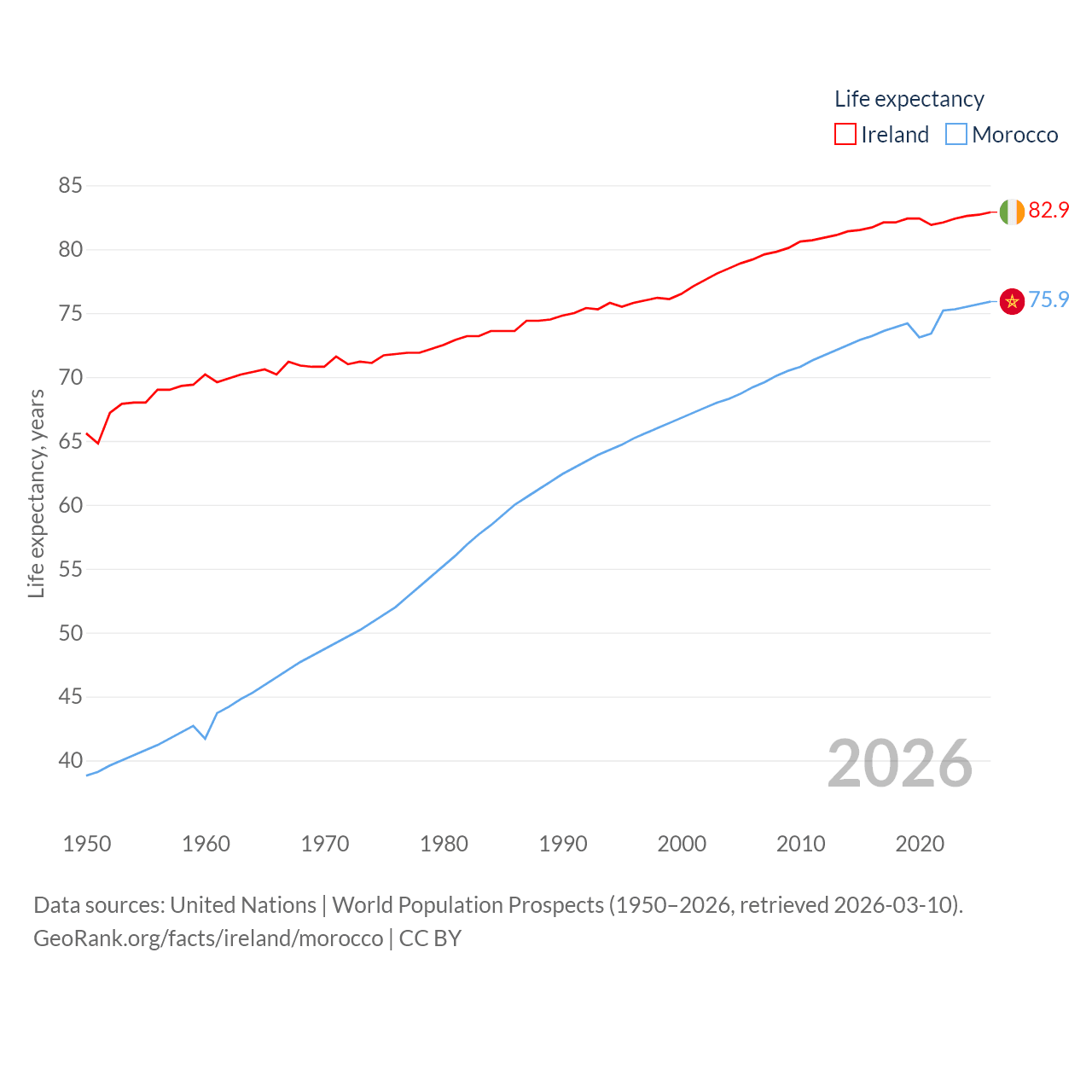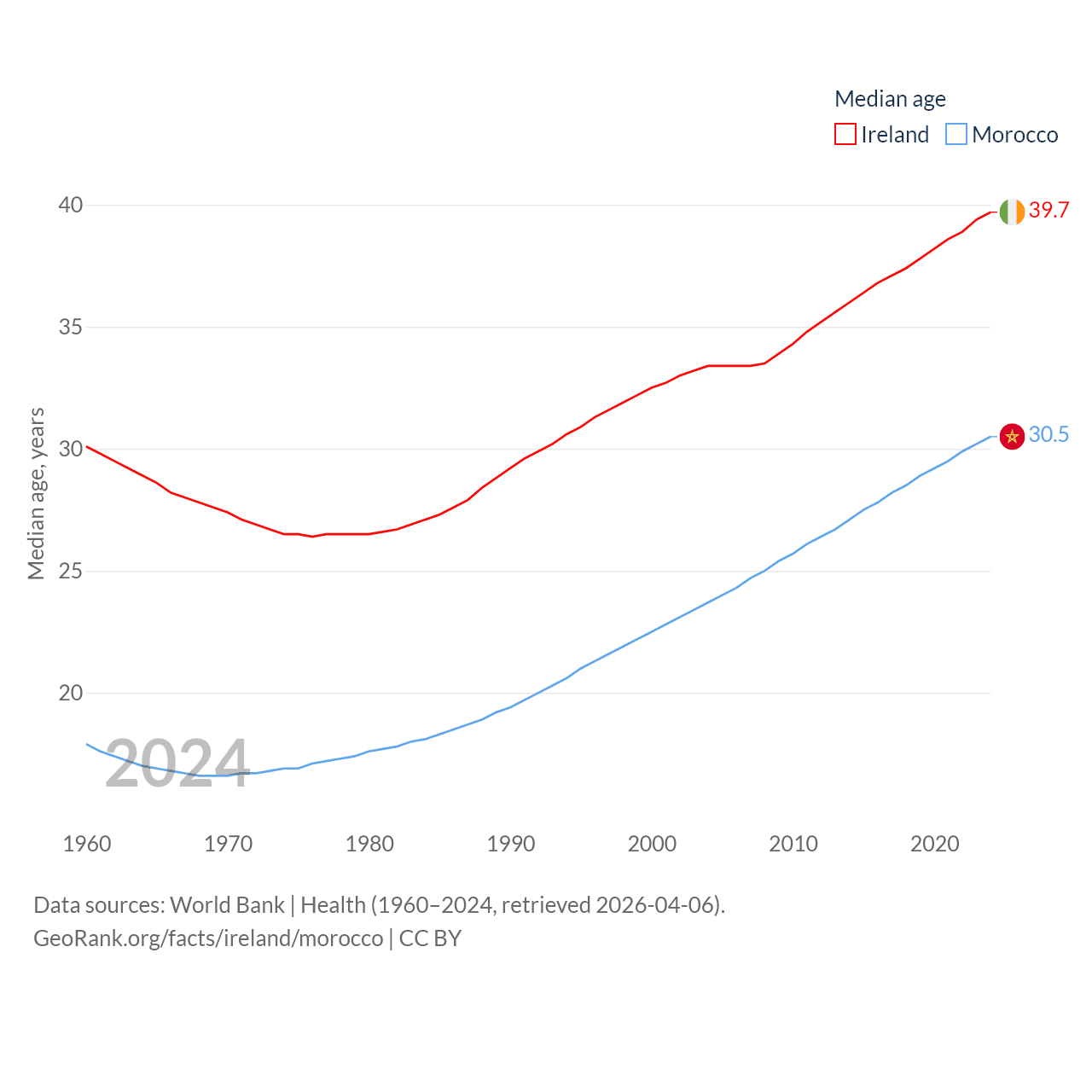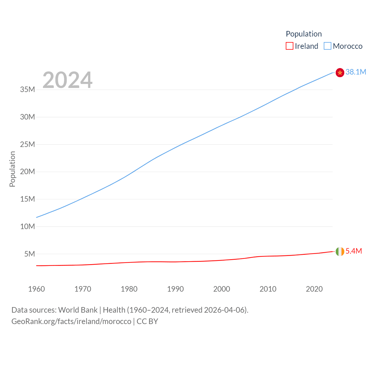 Ireland has a population of 5.4M (ranked 120/197), compared with 38.1M in Morocco (ranked 39/197). Ireland's land area is 26,599 sq mi versus 172,317 sq mi for Morocco (ranked 119th vs. 55th).