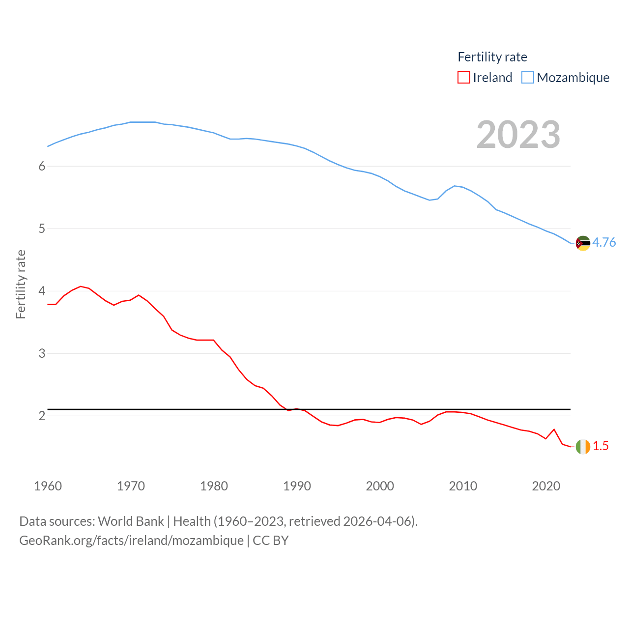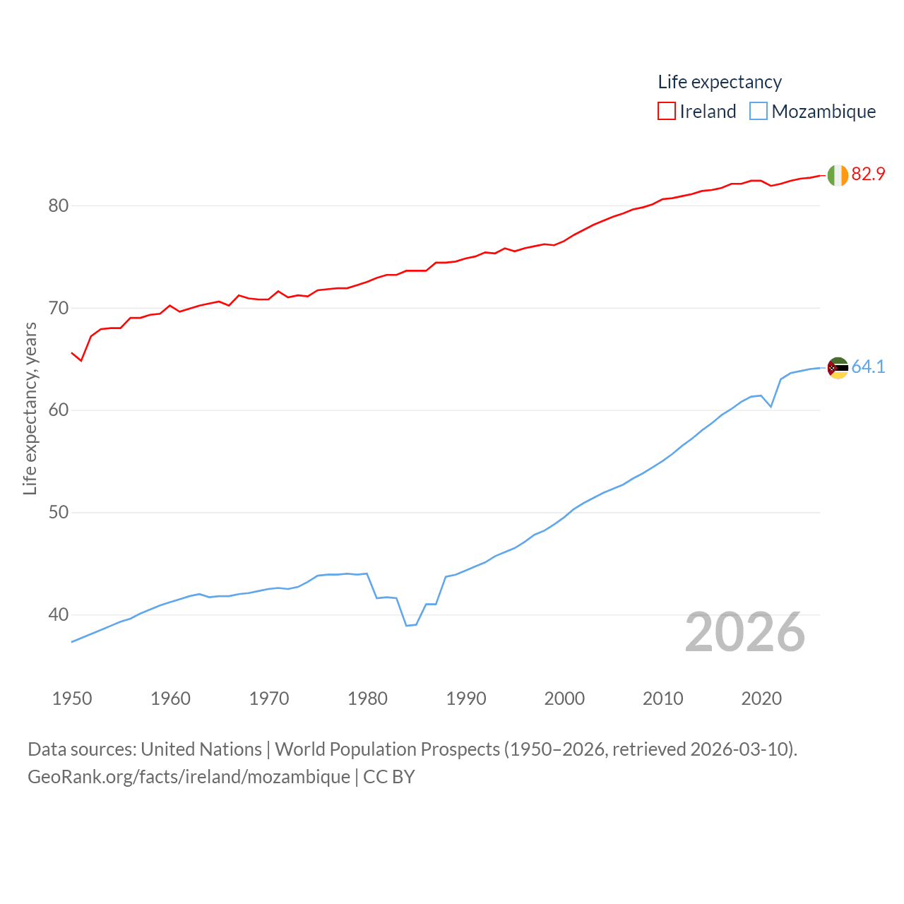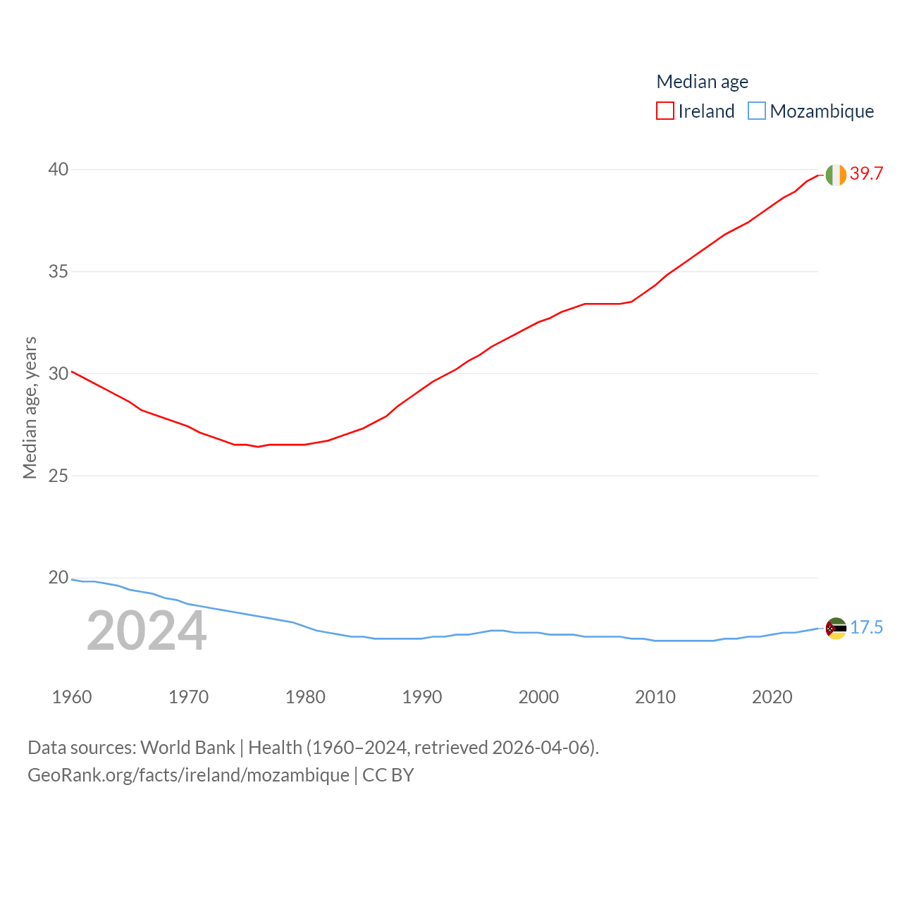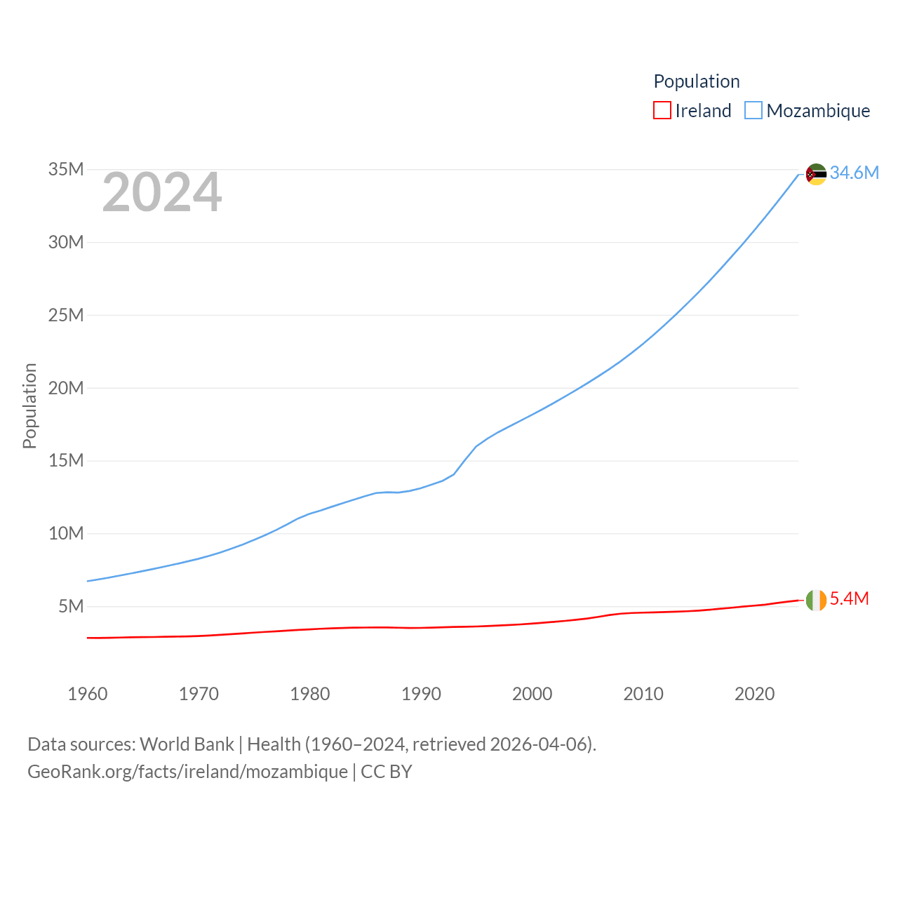 Ireland has a population of 5.4M (ranked 120/197), compared with 34.6M in Mozambique (ranked 46/197). Ireland's land area is 26,599 sq mi versus 303,623 sq mi for Mozambique (ranked 119th vs. 34th).