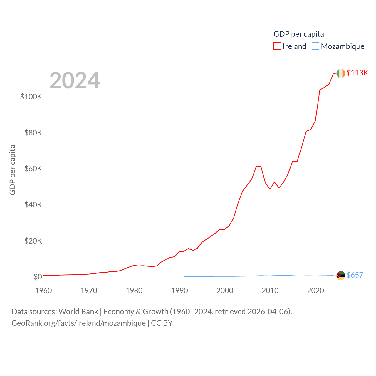 By GDP, Ireland ranks 25/197 ($609B) and Mozambique ranks 123/197 ($22.7B). By GDP per capita, Ireland ranks 4/197 ($112,895), while Mozambique ranks 189/197 ($657).