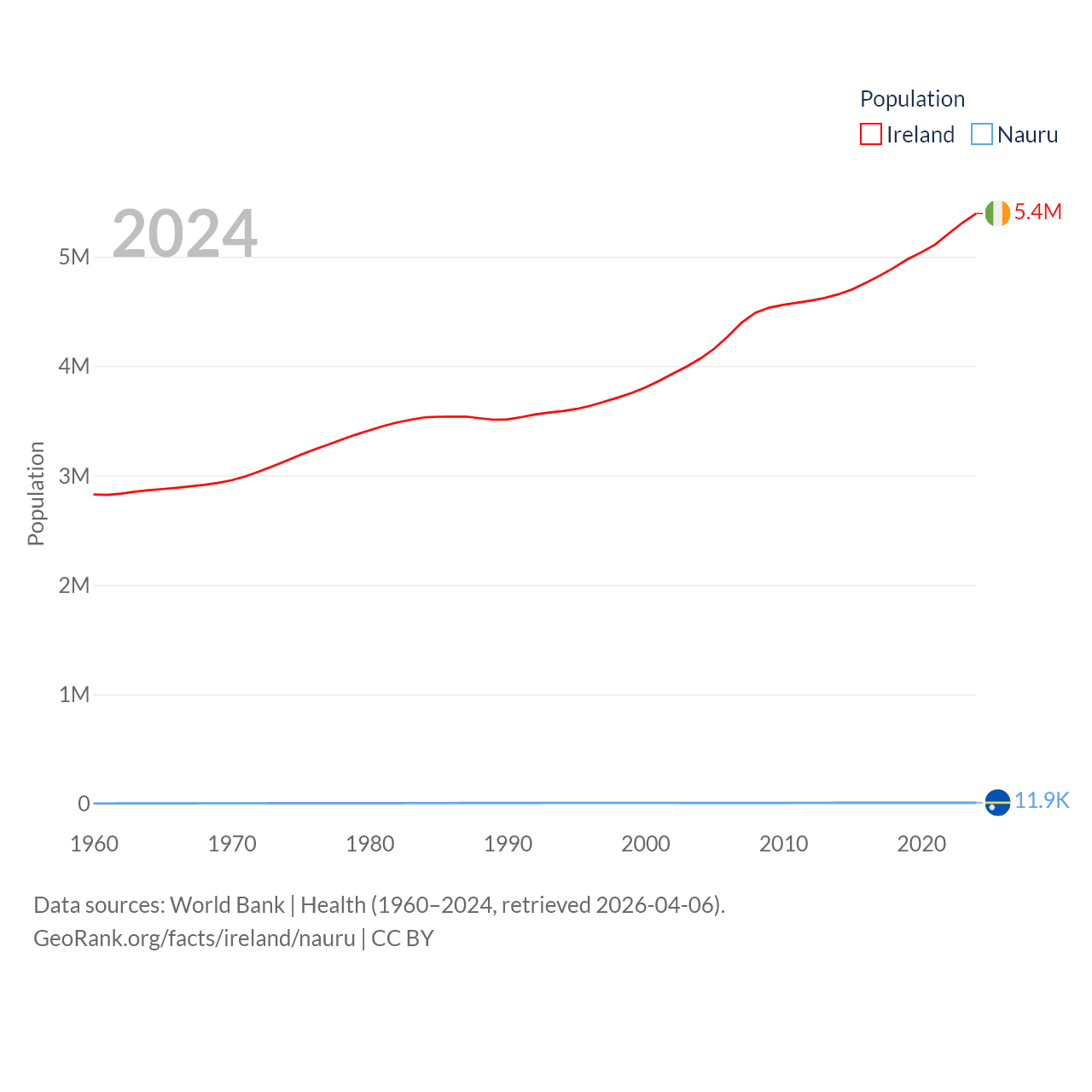 Ireland has a population of 5.4M (ranked 120/197), compared with 11.9K in Nauru (ranked 195/197). Ireland's land area is 26,599 sq mi versus 7.72 sq mi for Nauru (ranked 119th vs. 195th).