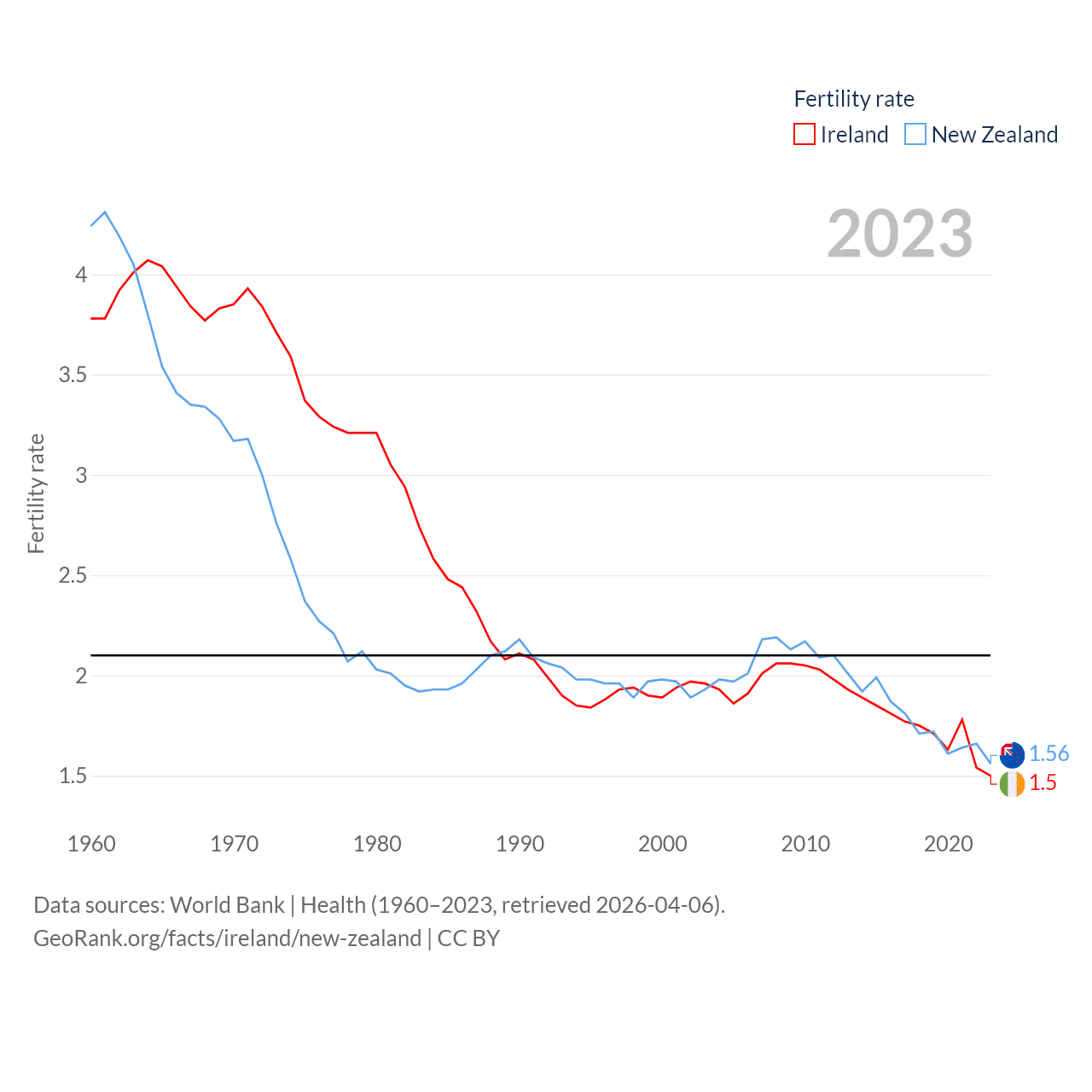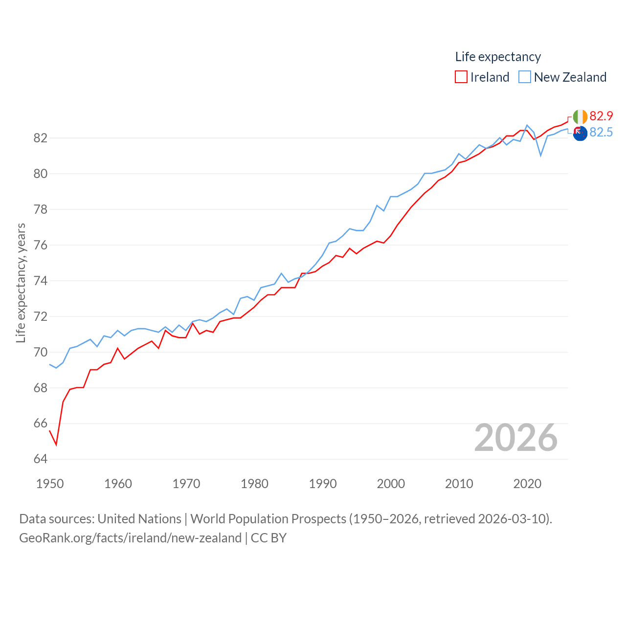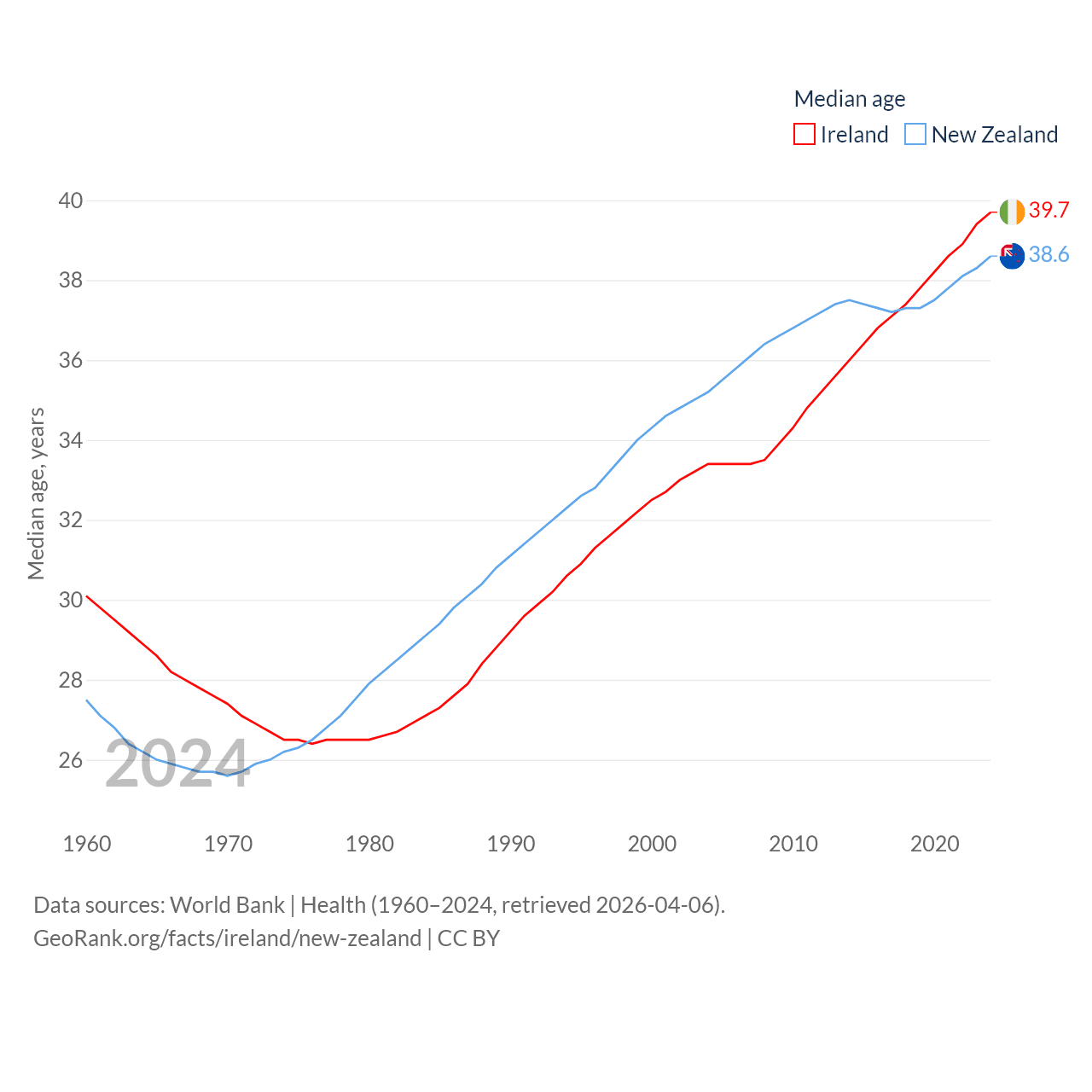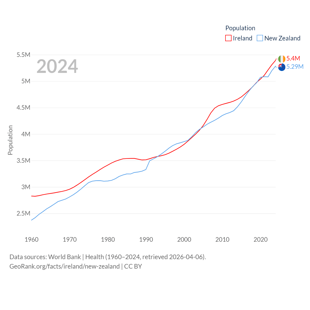 Ireland has a population of 5.4M (ranked 120/197), compared with 5.29M in New Zealand (ranked 123/197). Ireland's land area is 26,599 sq mi versus 101,665 sq mi for New Zealand (ranked 119th vs. 74th).