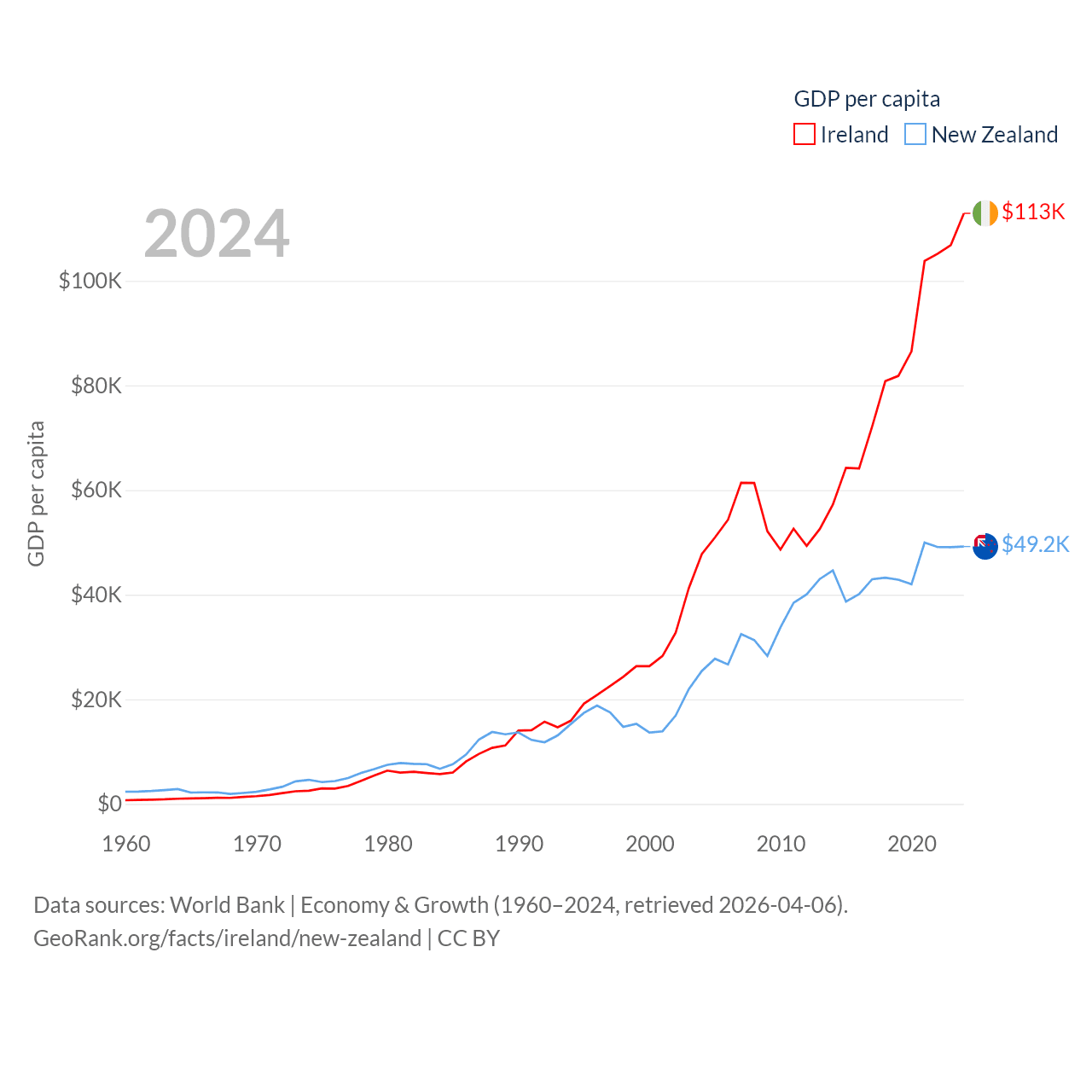 By GDP, Ireland ranks 25/197 ($609B) and New Zealand ranks 52/197 ($260B). By GDP per capita, Ireland ranks 4/197 ($112,895), while New Zealand ranks 26/197 ($49,205).