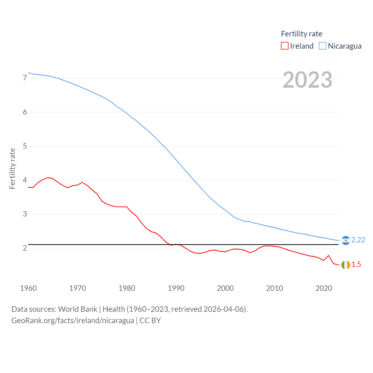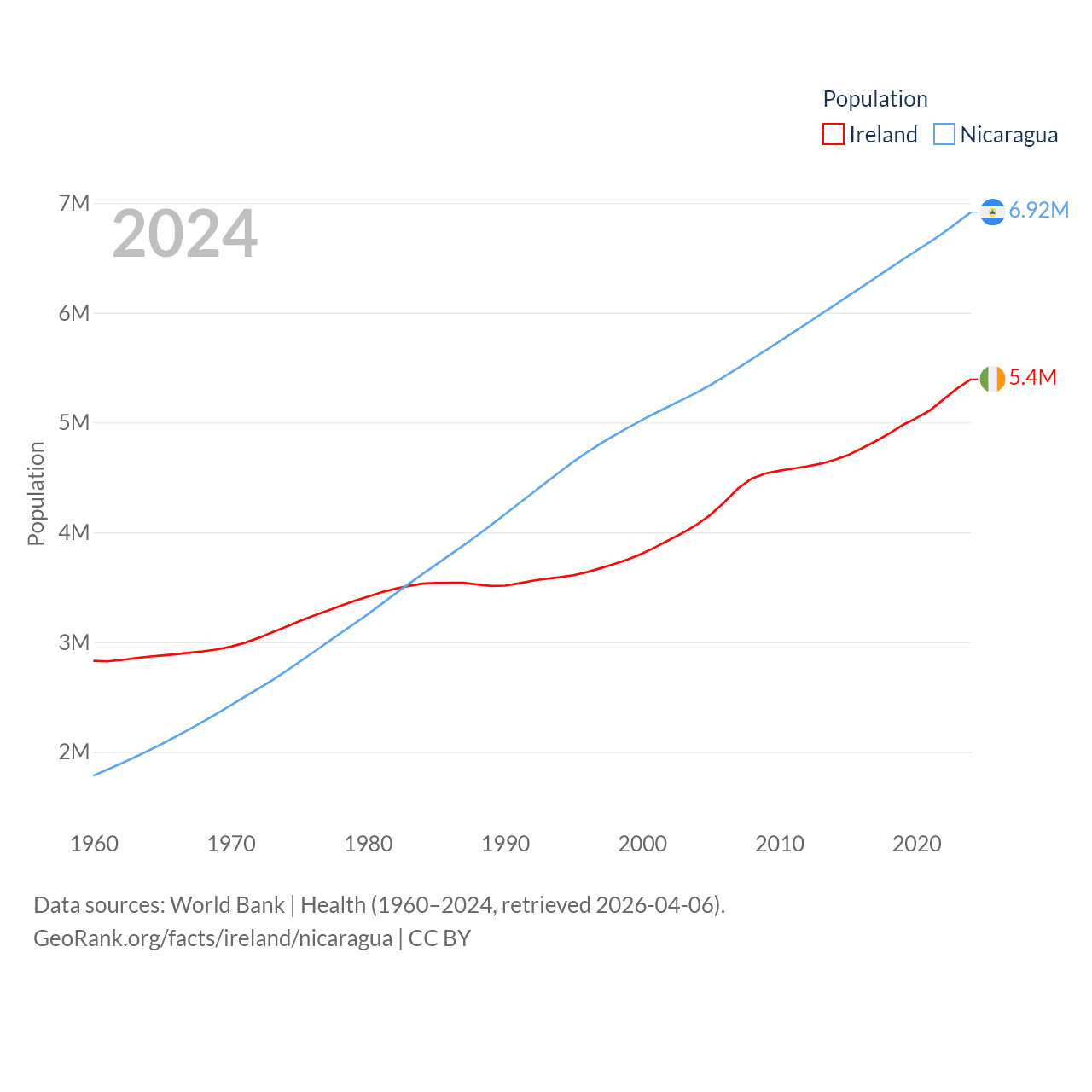 Ireland has a population of 5.4M (ranked 120/197), compared with 6.92M in Nicaragua (ranked 108/197). Ireland's land area is 26,599 sq mi versus 46,464 sq mi for Nicaragua (ranked 119th vs. 98th).